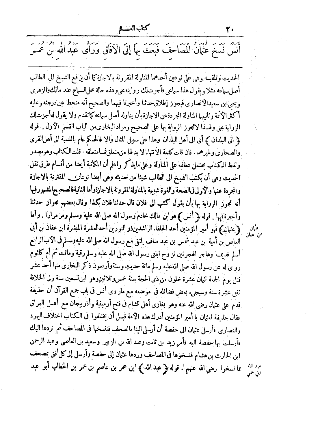 الحديث وتلقيه وهي على نوعين أحدهما المناولة المقرونة بالإجازة كما أن يرفع الشيخ إلى الطالب أصل سماعه مثلا ويقول هذا سماعي فأجزت لك روايته عني وهذه حالة محل السماع عند مالك والزهري ويحيى بن سعيد الأنصاري فيجوز إطلاق حدثنا وأخبرنا فيهما والصحيح أنه منحط عن درجته وعليه أكثر الأئمة وثانيهما المناولة المجردة عن الإجازة بأن يناوله أصل سماعه كما تقدم ولا يقول له أجزت لك الرواية عني ولهذا لا تجوز الرواية بها على الصحيح ومراد البخاري من باب القسم الأول, قوله- ((إلى البلدان)) - أي إلى أهل البلدان وهذا على سبيل المثال وإلا فالحكم عام بالنسبة إلى أهل القرى والصحاري وغيرهما, فان قلت كلمة الانتهاء لابد لها من متعلق فما متعلقه, قلت الكتاب وهو المصدر ولفظ الكتاب يحتمل عطفه على المناولة وعلى ما يذكر وأعلم أن المكاتبة أيضا من أقسام طرق نقل الحديث وهي أن يكتب الشيخ إلى الطالب شيئا من حديثه وهي أيضا نوعان المقترنة بالإجازة والمجردة عنها والأولى في الصحة والقوة شبيهة بالمناولة المقروءة بالإجازة وأما الثانية فالصحيح المشهور فيها أنه تجوز الرواية بها بأن تقول كتب إلى فلان قال حدثنا فلان بكذا وقال بعضهم بجواز حدثنا وأخبرنا فيها, قوله- ((أنس)) - هو ابن مالك خادم رسول الله صلى الله عليه وسلم ومر مرارا, وأما - ((عثمان)) - فهو أمير المؤمنين أحد الخلفاء الراشدين ذو النورين أحد العشرة المبشرة ابن عفاف بن أبي العاص بن أمية بن عبد شمس بن عبد مناف يلتقي مع رسول الله صلى الله عليه وسلم في الأب الرابع أسلم قديما وهاجر الهجرتين تزوج ابنتي الرسول صلى الله عليه وسلم رقية وماتت ثم أم كلثوم روى له عن رسول الله صلى الله عليه وسلم مائة حديث وستة وأربعون ذكر البخاري منها أحد عشر قتل يوم الجمعة لثمان عشرة خلون من ذي الحجة سنة خمس وثلاثين وهو ابن تسعين سنة ولى الخلافة ثنتي عشرة سنة وسيجيء بعض فضائله مع ما روى أنس في باب جمع القرآن أن حذيفة قدم على عثمان رضي الله عنه وهو يغازي أهل الشام في فتح أرمينية وأذربيجان مع أهل العراق وقال حذيفة لعثمان يا أمير المؤمنين أدرك هذه الأمة قبل أن يختلفوا في الكتاب اختلاف اليهود والنصارى فأرسل عثمان إلى حفصة أن أرسلي إلينا بالمصحف فننسخها في المصاحف ثم نردها إليك فأرسلت بها حفصة إليه فأمر زيد بن ثابت وعبدالله بن زبير وسعيد بن العاصي وعبدالرحمن ابن حارث بن هشام فنسخوها في المصاحف وردها عثمان إلى حفصة وأرسل إلى كل أفق بمصحف مما نسخوا رضي الله عنهم, قوله- ((عبدالله)) - ابن عمر بن الخطاب أبو عبد