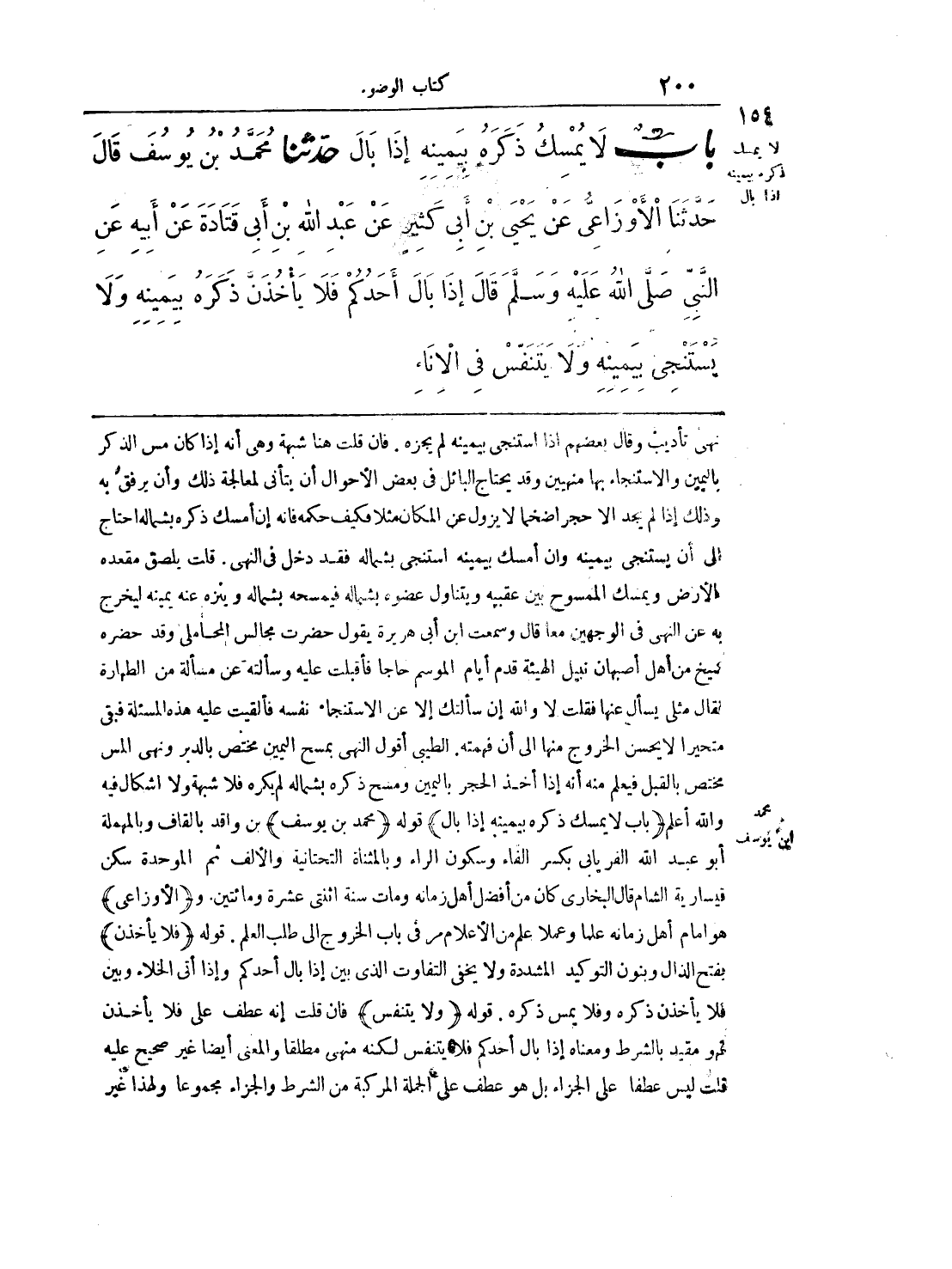 نهى تأديب وقال بعضهم إذا استنجى بيمينه لم يجزه. فان قلت هما شبهة وهي أنه إذا كان مس الذكر باليمين والاستنجاء بها منهيين وقد يحتاج البائل في بعض الأحوال أن يتأنى لمعالجة ذلك وأن يرفق به وذلك إذا لم يجد إلا حجرا ضخما لا يزول عن المكان مثلا فكيف حكمه فانه أن أمسك ذكره بشماله احتاج إلى أن يستنجي بيمينه وان أمسك بيمينه استنجى بشماله فيمسحه وينزه عنه يمينه ليخرج به عن النهي في الوجهين معا قال وسمعت ابن أبي هريرة يقول حضرت مجالس المحاملي وقد حضره شيخ من أهل أصبهان نبيل الهيئة قدم أيام الموسم حاجا فأقبلت عليه وسألته عن مسألة من الطهارة فقال مثلي يسأل عنها فقلت لا والله أن سألته إلا عن الاستنجاء نفسه فألقيت عليه هذه المسئلة فبقى متحيرا لا يحسن الخروج منها إلى أن فهمته. الطيبي أقول النهي بمسح اليمين مختص بالدبر ونهى المس مختص بالقبل فيعلم منه أنه إذا أخذ الحجر باليمين ومسح ذكره بشماله لم يكره فلا شبهة ولا إشكال فيه والله أعلم (باب لا يمسك ذكره بيمينه إذا بال) قوله (محمد بن يوسف) بن واقد بالقاف وبالمهملة أبو عبد الله الفرياني بكسر الفاء وسكون الراء وبالمثناة التحتانية والألف ثم الموحدة سكن فيسارية الشام قال البخاري كان من أفضل أهل زمانه ومات سنة اثنتي عشرة ومائتين. و (الأوزاعي) هو أمام أهل زمانه علما وعملا من الأعلام مر فب باب الخروج إلى طلب العلم. قوله (فلا يأخذن) بفتح الذال وبنون التوكيد المشددة ولا يخفى التفاوت الذي بين إذا بال أحدكم وإذا أتى الخلاء وبين فلا يأخذن ذكره فلا يمس. قوله (وإذا يتنفس) فان قلت انه عطف على فلا يأخذن فهو مقيد بالشرط ومعناه إذا بال أحدكم فلا يتنفس لكنه منهى مطلقا والمعنى أيضا غير صحيح عليه قلت ليس عطفا على الجزاء بل هو عطف على الجملة المركبة من الشرط والجزاء مجموعا ولهذا غير