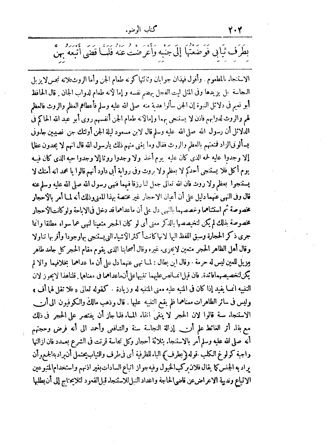 الاستنجاء بالمطعوم. وأقول فهذان جوابان وثالثها كونه طعام الجن وأما الروث فلأنه نجس لا يزيل النجاسة بل يزيدها وفي المثل ليت الفجل يهضم نفسه وأما لأنه طعام لدواب الجان. قال الحافظ أبو نعيم في دلائل النبوة أن الجن سألوا هدية منه صلى الله عليه وسلم فأعطاهم العظم والروث فالعظم لهم والروث لدوابهم فإذن لا يستنجي بهما وإما لأنه طعام الجن أنفسهم روى أبو عبد الله الحاكم في الدلائل أن رسول الله صلى الله عليه وسلم قال لابن مسعود ليلة الجن أولئك جن نصيبين جاءوني يسألوني الزاد فمتعهم بالعظم والروث فقال وما يغني منهم ذلك يا رسول الله قال أنهم لا يجدون عظما إلا وجدوا عليه لحمه الذي كان عليه يوم أخذ ولا وجدوا روثا إلا وجدوا حبه الذي كان فيه يوم أطل فلا يستنجي أحدكم لا بعظم ولا بروث وفي رواية أبي داود أنهم قالوا يا محمد أنه أمتك لا يستنجوا بعظم ولا روث فان الله تعالى جعل لنا رزقا فيهما فنهى رسول الله صلى الله عليه وسلم عنه قال وفى النهي عنهما دليل عنهما على أن أعيان الأحجار غير مختصة بهذا المعنى وذلك أنه لما أمر بالأحجار مخصوصة ثم استثناها وخصصهما بالنهي دل على أن ما عداهما قد دخل في الإباحة ولو كانت الأحجار مخصوصة بذلك لم يكن لتخصيصها بالذكر معنى أي لو كان الحجر متيعنا لنهى عما سواه مطلقا وإنما جرى ذكر الحجارة وسبق اللفظ إليها لأنها كانت أكثر الأشياء التي يستنجي بها وجودا وأقربها تناولا وقال أهل الظاهر الحجر متعين لا يجزى, غيره وقال أصحابنا الذي يقوم مقام الحجر كل جامد طاهر مزيل للعين ليس له حرمة. وقال ابن بطال: لما نهى عنهما دل على أن ما عداهما بخلافهما وإلا لم يكن لتخصيصهما فائدة, فان قيل إنما نص عليهما تنبيها على أن ما عداهما في معناهما, قلنا هذا لا يجوز لان التنبيه إنما يفيد إذا كان في المنبه عليه معنى المتنبه له وزيادة, كقوله تعالى<< فلا تقل لهما أف>> وليس في سائر الطاهرات معناهما فلم يقع التنبيه عليها, قال وذهب مالك والكوفيون إلى أن الاستنجاء سنة قالوا لان الحجر لا ينقي أنقاء الماء فلما جاز أن يقتصر على الحجر في ذلك مع بقاء أثر الغائط علم أن إزالة النجاسة سنة والشافعي وأحمد إلى أنه فرض وحجتهم أنه صلى الله عليه وسلم أمر بالاستنجاء بثلاثة أحجار وكل نجاسة قرنت في الشرع بعدد فان إزالتها واجبة كولوغ الكلب, قوله (بطرف) الباء للظرفية أي في طرف والثياب يحتمل أن يراد به الجمع وأن يراد به الجنس كما يقال فلان يركب الخيول وفيه جواز إتباع السادات بغير إذنهم واستخدام المتبوعين الأتباع وندبية الاعراض عن قاضي الحاجة وإعداد النبل للاستنجاد قبل القعود لئلا يحتاج إلى أن يطلبها