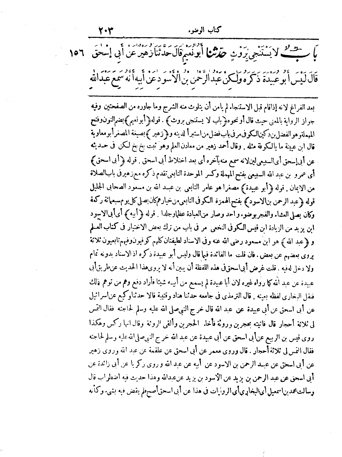 بعد الفراغ لأنه إذا قام قبل الاستنجاد لم يامن أن يتلوث منه الشرج وما جاوره من الصفحتين وفيه جواز الرواية بالمعنى حيث قال أو نحوه (باب لا يستنجى بروث)، قوله (أبو نعيم) بضم النون وفتح المهملة وهو الفضل بن دكين الكوفي مر في باب فضل من استبرأ لدينه و (زهير) بصيغة المصغر أبو معاوية قال ابن عيينة ما بالكوفة مثله، وقال أحمد زهير من معادن العلم وهو ثبت بخ بخ لكن في حديثه عن أبى اسحق أي السبيعى لين لأنه سمع منه بآخره أي بعد اختلاط أبى اسحق، قوله (أبى اسحق) أي عمرو بن عبد الله السبيعي بفتح المهملة وكسر الموحدة التابعي تقدم ذكره مع زهير في باب الصلاة من الإيمان، قوله (أبو عبيدة) مصغرا هو عامر التابعي بن عبد الله بن مسعود الصحابي الجليل قوله (عبد الرحمن بن الأسود) بفتح الهمزة الكوفي التابعي من خيارهم كان يصلي كل يوم سبعمائة ركعة وكان يصلي العشاء والفجر بوضوء واحد وصار من العبادة عظما وجلدا. قوله (أبيه) أي أبى الأسود ابن يزيد من الزيادة ابن قيس الكوفي النخعى مر في باب من ترك بعض الاختيار في كتاب العلم و (عبد الله) هو ابن مسعود رضي الله عنه وفي الإسناد لطيفتان كلهم كوفيون وفيهم تابعيون ثلاثة يروى بعضهم عن بعض، فان قلت ما الفائدة فيما قال وليس أبو عبيدة ذكره إذ الإسناد بدونه تمام ولا دخل له فيه، قلت غرض أبى اسحق في هذه اللفظة أن يبين أنه لا يروى هذا الحديث عن طريق أبى عبيدة عن عبد الله كما رواه غيره لان أبا عبيدة لم يسمع من أبيه شيئا فأراد دفع وهم من توهم ذلك فنقل البخاري لفظه بعينه، قال الترمذى في جامعه حدثنا هناد وقتيبة قالا حدثنا وكيع عن إسرائيل عن أبى اسحق عن أبى عبيدة عن عبد الله قال خرج النبي صلى الله عليه وسلم لحاجته فقال التمس لي ثلاثة أحجار قال فأتيته بحجرين وروثة فأخذ الحجرين وألقى الروثة وقال أنها ركس وهكذا روى قيس بن الربيع عن أبى اسحق عن أبى عبيدة عن عبد الله خرج النبي صلى الله عليه وسلم لحاجته فقال التمس لي ثلاثة أحجار، قال وروى معمر عن أبى اسحق عن علقمة عن عبد الله وروى زهير عن أبى اسحق عن عبد الرحمن بن الأسود عن أبيه عن عبد الله وروى زكريا عن أبى رائدة عن أبى اسحق عن عبد الرحمن بن يزيد عن الأسود بن يزيد عن عبد الله وهذا حديث فيه اضطراب قال وسالت محمد بن اسمعيل أي البخاري أي الروايات في هذا عن أبى اسحق أصح فلم يقض فيه بشيء وكأنه