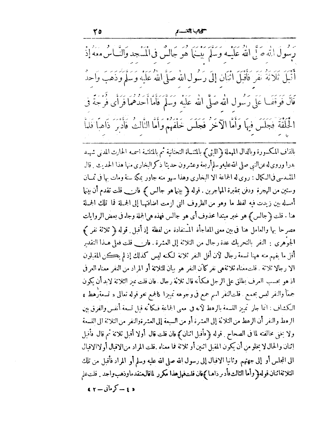 بالقاف المكسورة وبالدال المهملة (الليثي) بالمثناة التحتانية ثم المثلثة اسمه الحارث المدني شهد بدرا وروي له عن النبي صلي الله عليه وسلم أربعة وعشرون حديثا ذكر منها هذا الحديث. قال المقدسي في الكمال: روي له الجماعة إلا البخاري وهذا سهو منه جاور بمكة سنة ومات بها في ثمان وستين من الهجرة ودفن بمقبرة المهاجرين. قوله (بينما هو جالس) فإن قلت تقدم أن بينما أصله بين زيدت فيه لفظ ما وهو من الظروف التي لزمت إضافتها إلي الجملة فما تلك الجملة هنا. قلت (جالس) هو خبر مبتدأ محذوف أي هو جالس فهذه هي الجملة وجاء في بعض الروايات مصرحا بها والعامل هنا في بين معني المفاجأة المستفادة من لفظه إذ أقبل. قوله (ثلاثة نفر) الجوهري: النفر بالتحريك عدة رجال من الثلاثة إلي العشرة. فإن قلت فعلي هذا التقدير أقل ما يفهم منه ههنا تسعة رجال لأن أقل النفر ثلاثة لكنه ليس كذلك إذ لم يكن المقبلون إلا رجالا ثلاثة. قلت معناه ثلاثة هي نفر كأن النفر هو بيان للثلاثة أو المراد من النفر معناه العرفي إذ هو بحسب العرف يطلق علي الرجل فكأنه قال ثلاثة رجال. فإن قلت مميز الثلاثة لا بد أن يكون جمعا والنفر ليس بجمع. قلت النفر اسم جمع في وجوهه تمييزا كالجمع نحو قوله تعالي «تسعة رهط» الكشاف: إنما جاز تمييز التسعة بالرهط لأنه في معني الجماعة فكأنه قيل تسعة أنفس والفرق بين الرهط والنفر أن الرهط من الثلاثة إلي العشرة أم من السبعة إلي العشرة والنفر من الثلاثة إلي التسعة ولا يخفي مخالفته لما في الصحيح. قوله (فأقبل اثنان) فإن قلت قال أولا أقبل ثلاثة ثم قال فأقبل اثنان والحال لا يخلوا من أن يكون المقبل اثنين أو ثلاثة فما معناه. قلت المراد من الإقبال أولا الإقبال إلي المجلس أو إلي جهتهم وثانيا الإقبال إلي رسول الله صلي الله عليه وسلم أو المراد فأقبل من تلك الثلاثة اثنان. قوله (وأما الثالث فأدبر ذاهبا) فأن قلت فهل هذا مكرر لما قال متقدما وذهب واحد. قلت علم