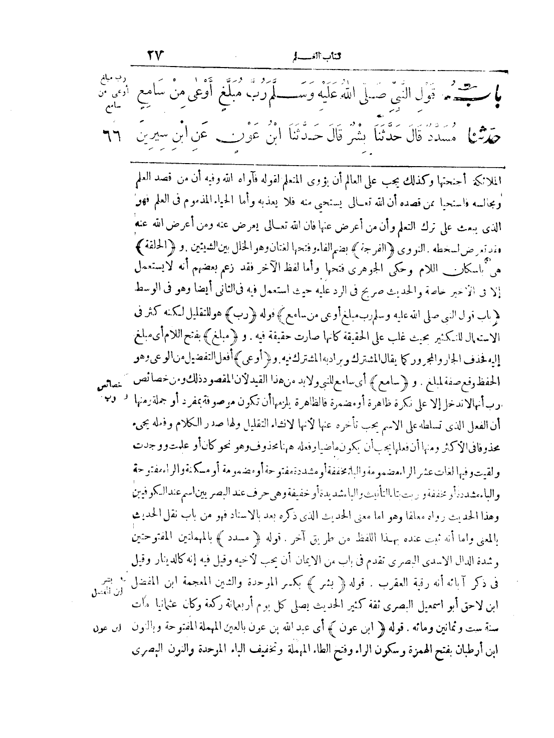 66 - حَدَّثَنَا مُسَدَّدٌ قَالَ حَدَّثَنَا بِشْرٌ قَالَ حَدَّثَنَا ابْنُ عَوْنٍ عَنِ ابْنِ سِيرِينَ