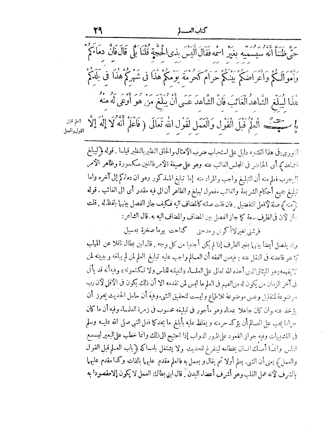 وقد يفصل أيضا بينهما بغير الظرف إذا لم يكن أجنبيا من كل وجه. قال ابن بطال ناقلا عن المهلب كما هو قاعدته في النقل عنه: فيه من الفقه أن العالم واجب عليه تبليغ العلم لمن لم يبلغه ويبينه لمن لا يفهمه وهو الميثاق الذي أخذه الله تعالي علي العلماء «لتبيينه للناس ولا تكتمونه» وفيه أنه قد يأتي في آخر الزمان من يكون له من الفهم في العلم ما ليس لمن تقدمه إلا أن ذلك يكون في الأقل لأن رب موضوعة للتقليل وعسي موضوعة للإطماع وليست لتحقيق الشيء وفيه أن حامل الحديث يجوز أن يؤخذ عنه وإن كان جاهلا بمعناه وهو مأجور في تبليغه محسوب في زمرة العلماء وفيه أن ما كان حراما يجب علي العالم أن يؤكد حرمته ويغلظ عليه بأبلغ ما يجد كما فعل النبي صلي الله عليه وسلم في التشبيهات وفيه جواز القعود علي ظهور الدواب إذا احتيج إلي ذلك وإنما خطب علي البعير ليسمع الناس وإنما أمسك إنسان بخطامه ليتفرغ للحديث ولا يشتغل بإمساكه (باب العلم قبل القول والعمل) يعني أن الشيء يعلم أولا ثم يقال ويعمل به فالعلم مقدم عليهما بالذات وكذا مقدم عليهما بالشرف لأنه عمل القلب وهو أشرف أعضاء البدن. قال ابن بطال: العمل لا يكون إلا مقصودا به