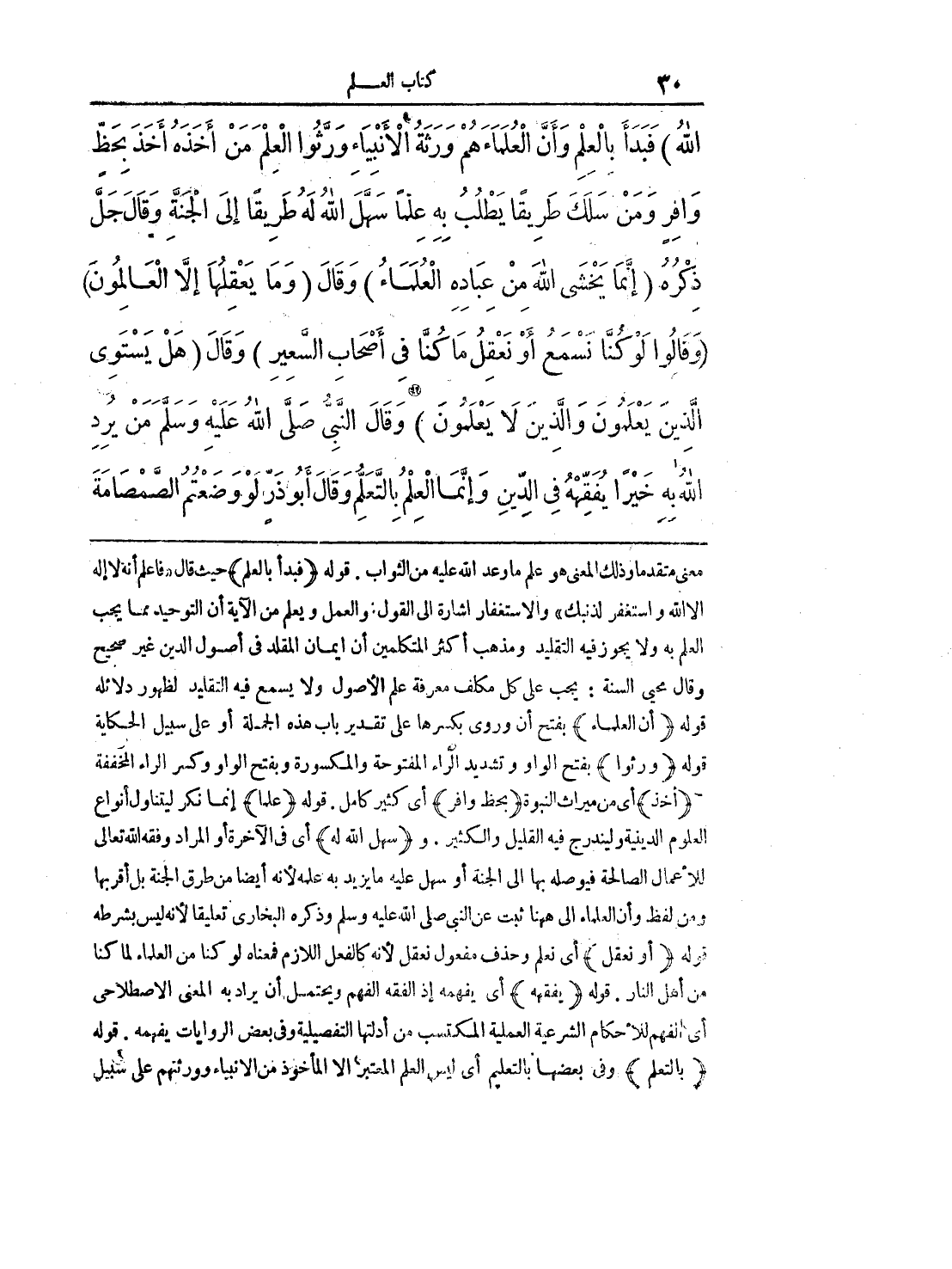 اللَّهُ) فَبَدَأَ بِالْعِلْمِ، وَأَنَّ الْعُلَمَاءَ هُمْ وَرَثَةُ الأَنْبِيَاءِ - وَرَّثُوا الْعِلْمَ - مَنْ أَخَذَهُ أَخَذَ بِحَظٍّ وَافِرٍ، وَمَنْ سَلَكَ طَرِيقاً يَطْلُبُ بِهِ عِلْماً سَهَّلَ اللَّهُ لَهُ طَرِيقاً إِلَى الْجَنَّةِ. وَقَالَ جَلَّ ذِكْرُهُ (إِنَّمَا يَخْشَى اللَّهَ مِنْ عِبَادِهِ الْعُلَمَاءُ) وَقَالَ (وَمَا يَعْقِلُهَا إِلاَّ الْعَالِمُونَ) (وَقَالُوا لَوْ كُنَّا نَسْمَعُ أَوْ نَعْقِلُ مَا كُنَّا فِى أَصْحَابِ السَّعِيرِ). وَقَالَ (هَلْ يَسْتَوِى الَّذِينَ يَعْلَمُونَ وَالَّذِينَ لاَ يَعْلَمُونَ). وَقَالَ النَّبِىُّ صلى الله عليه وسلم «مَنْ يُرِدِ اللَّهُ بِهِ خَيْراً يُفَقِّهْهُ فِى الدِّينِ، وَإِنَّمَا الْعِلْمُ بِالتَّعَلُّمِ». وَقَالَ أَبُو ذَرٍّ لَوْ وَضَعْتُمُ الصَّمْصَامَةَ