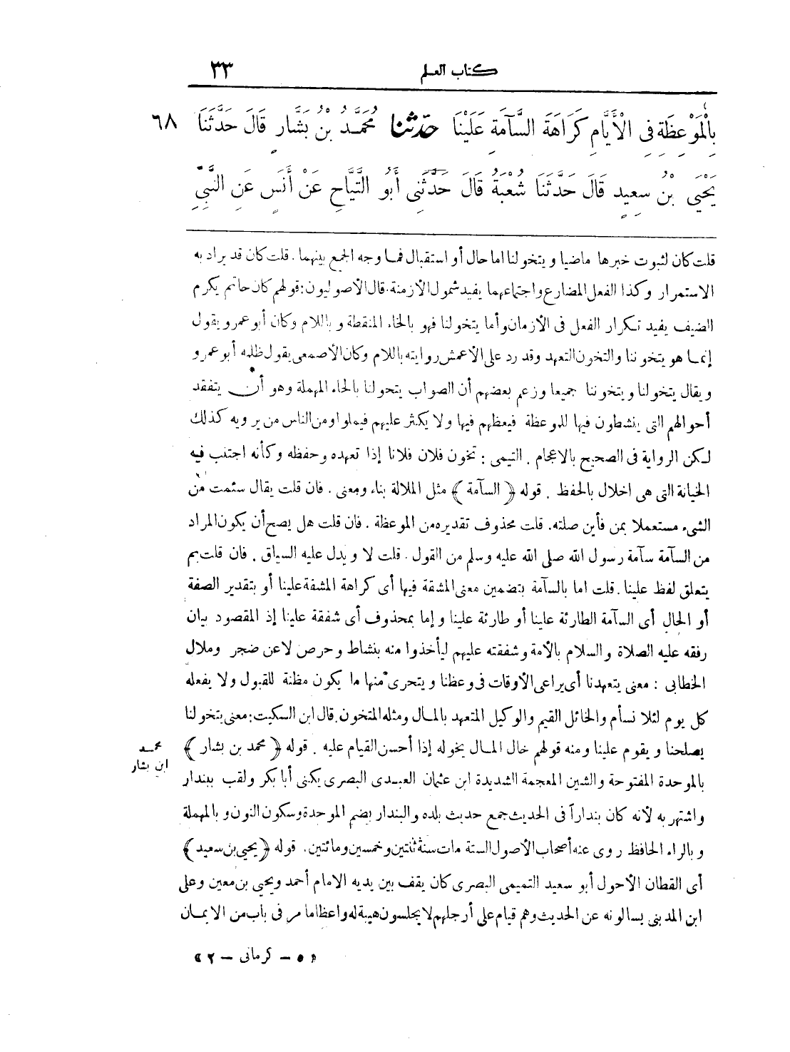 68 - حَدَّثَنَا مُحَمَّدُ بْنُ بَشَّارٍ قَالَ حَدَّثَنَا يَحْيَى بْنُ سَعِيدٍ قَالَ حَدَّثَنَا شُعْبَةُ قَالَ حَدَّثَنِى أَبُو التَّيَّاحِ عَنْ أَنَسٍ عَنِ النَّبِىِّ