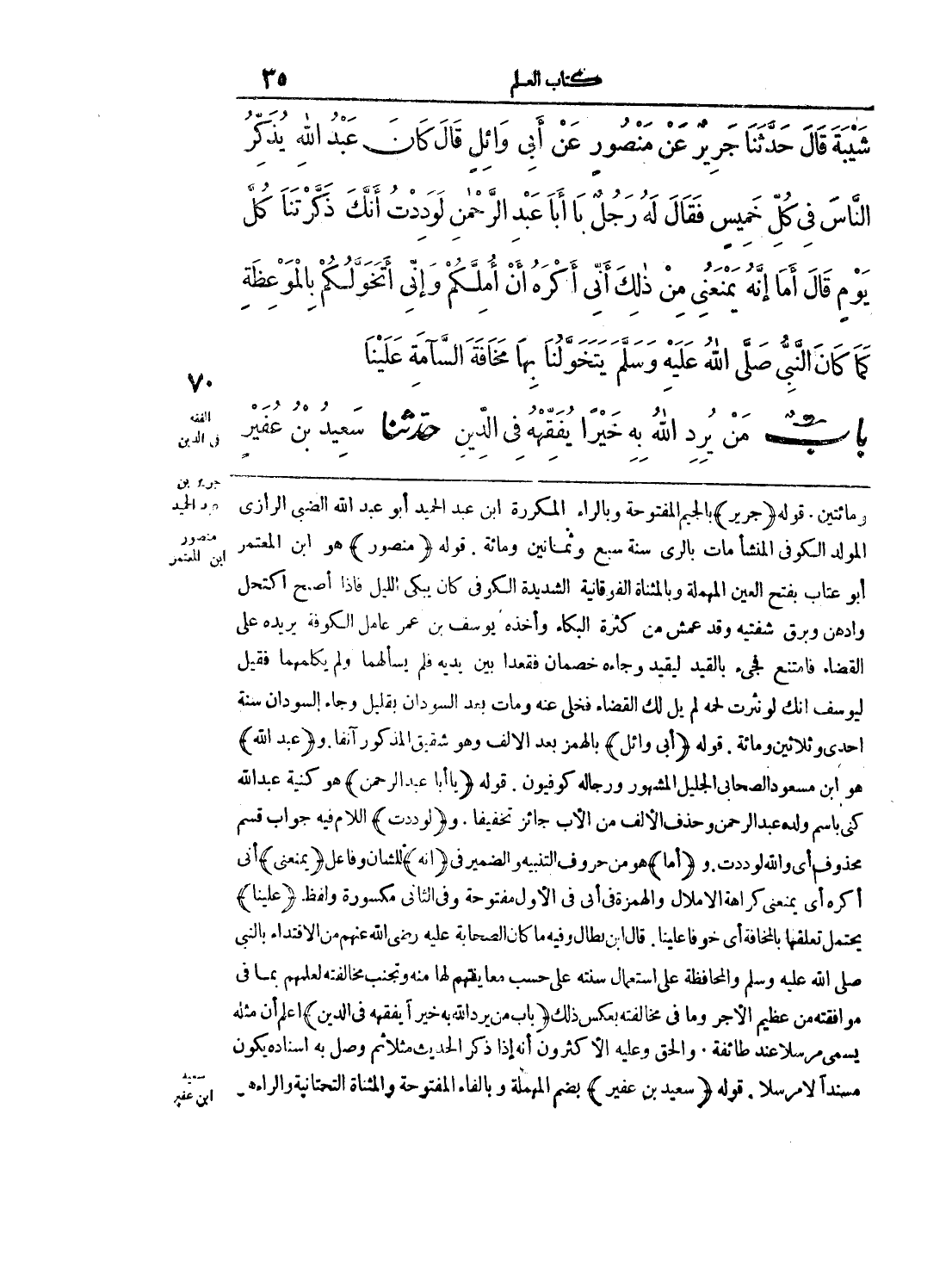 ومائتين. قوله (جرير) بالجيم المفتوحة وبالراء المكررة ابن عبد الحميد أبو عبد الله الضي الرازي المولد الكوفي المنشأ مات بالري سنة سبع وثمانين ومائة. قوله (منصور) هو ابن المعتمر أبو عتاب بفتح العين المهملة وبالمثناة الفوقانية الشديدة الكوفي كان يبكي الليل فإذا أصبح اكتحل وادهن وبرق شفتيه وقد عمش من كثرة البكاء وأخذه يوسف بن عمر عامل الكوفة يريده علي القضاء فامتنع فجيء بالقيد ليقيده وجاءه خصمان فقعدا بين يديه فلم يسألهما ولم يكلمهما فقيل ليوسف إنك لو نثرت لحمه لم يل لك القضاء فخلي عنه ومات بعد السودان بقليل وجاء السودان سنة إحدى وثلاثين ومائة. قوله (أبي وائل) بالهمز بعد الألف وهو شقيق المذكور آنفا. و (عبد الله) هو ابن مسعود الصحابي الجليل المشهور ورجاله كوفيون. قوله (يا أبا عبد الرحمن) هو كنية عبد الله كني باسم ولده عبد الرحمن وحذف الألف من الأب جائز تخفيفا. و (لوددت) اللام فيه جواب قسم محذوف أي والله لوددت. و (أما) هو من حروف التنبيه والضمير في (أنه) للشأن وفاعل (بمعني) أني أكره أي بمعني كراهة الإملال والهمزة في أبي في الأول مفتوحة وفي الثاني مكسورة ولفظ (علينا) يحتمل تعلقها بالخافة أي خوفا علينا. قال ابن بطال وفيه ما كان الصحابة عليه رضي الله عنهم من الإقتداء بالنبي صلي الله عليه وسلم والمحافظة علي استعمال سنته علي حسب معاينتهم لها وتجنب مخالفته لعلمهم بما في موافقته من عظيم الأجر وما في مخالفته بعكس ذلك (باب من يرد الله به خيرا يفقه في الدين) اعلم أن مثله يسمي مرسلا عند طائفة. والحق وعليه الأكثرون أنه إذا ذكر الحديث مثلا ثم وصل به إسناده يكون مسندا لا مرسلا. قوله (سعيد بن عفير) بضم المهملة وبالفاء المفتوحة والمثناة التحتانية والراء