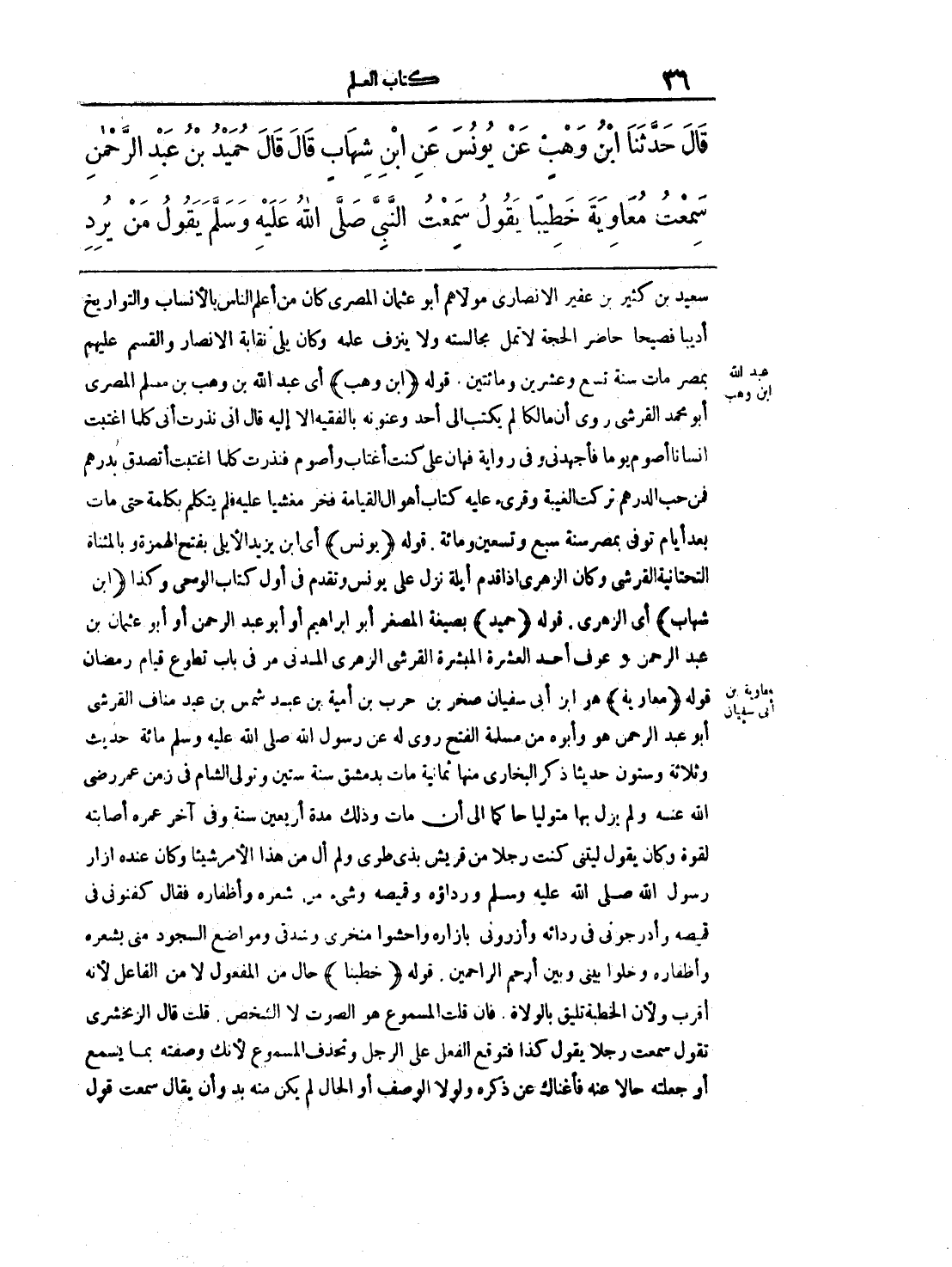 قَالَ حَدَّثَنَا ابْنُ وَهْبٍ عَنْ يُونُسَ عَنِ ابْنِ شِهَابٍ قَالَ قَالَ حُمَيْدُ بْنُ عَبْدِ الرَّحْمَنِ سَمِعْتُ مُعَاوِيَةَ خَطِيباً يَقُولُ سَمِعْتُ النَّبِىَّ صلى الله عليه وسلم يَقُولُ: «مَنْ يُرِدِ