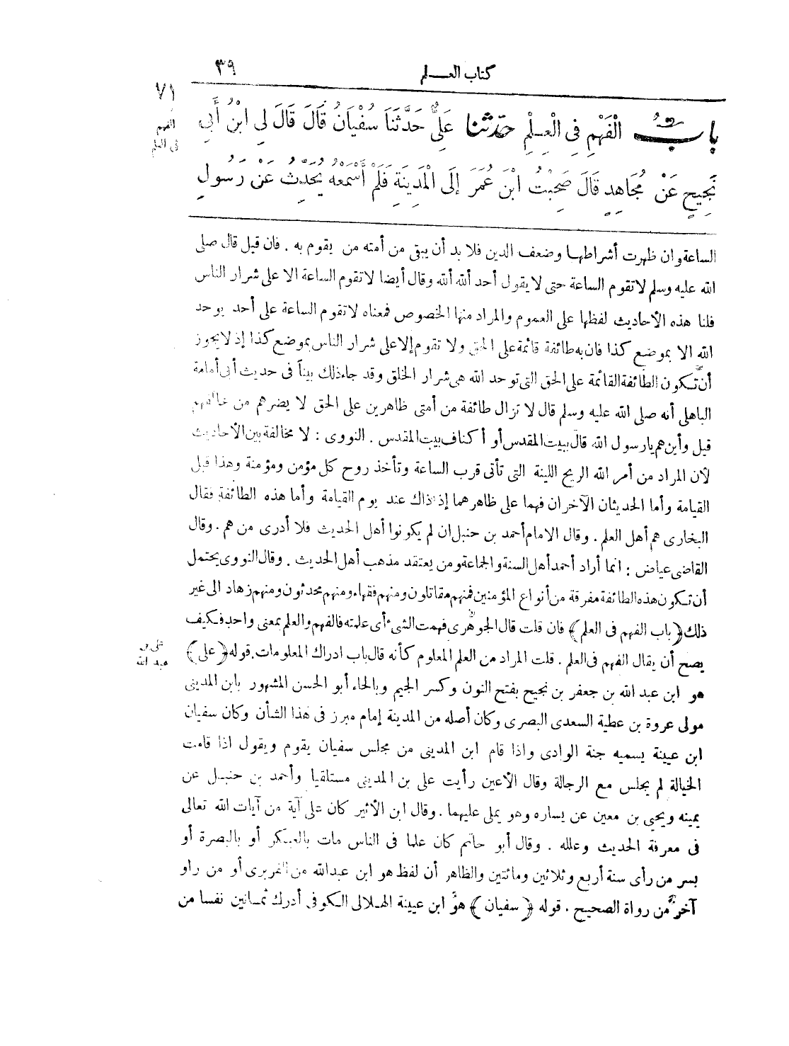 الساعة وإن ظهرت أشراطها وضعف الدين فلا بد أن يبقي من أمته من يقوم به. فإن قيل قال صلي الله عليه وسلم لا تقوم الساعة حتي لا يقول أحد الله الله وقال أيضا لا تقوم الساعة إلا علي شرار الناس فلنا هذه الأحاديث لفظها علي العموم والمراد منها الخصوص فمعناه لا تقوم الساعة علي أحد يوحد الله إلا بموضع كذا فإن به طائفة قائمة علي الحق ولا تقوم إلا علي شرار الناس بموضع كذا إذ لا يجوز أن تكون الطائفة القائمة علي الحق التي توحد الله هي شرار الخلق وقد جاء ذلك بينا في حديث أبي أمامة الباهلي أنه صلي الله عليه وسلم قال لا تزال طائفة من أمتي ظاهرين علي الحق لا يضرهم من خالفهم قيل وأين هم يا رسول الله قال ببيت المقدس أو أكناف بيت المقدس. النووي: لا مخالفة بين الأحاديث لأن المراد من أمر الله الريح اللينة التي تأتي قرب الساعة وتأخذ روح كل مؤمن ومؤمنة وهذا قبل القيامة وأما الحديثان الآخران فهما علي ظاهر هما إذ ذاك عند يوم القيامة وأما هذه الطائفة فقال البخاري هم أهل العلم. وقال الأمام أحمد بن حنبل إن لم يكونوا أهل الحديث فلا أدري من هم. وقال القاضي عياض: إنما أراد أحمد أهل السنة والجماعة ومن يعتقد مذهب أهل الحديث. وقال النووي يحتمل أن تكون هذه الطائفة مفرقة من أنواع المؤمنين فمنهم مقاتلون ومنهم فقهاء ومنهم محدثون ومنهم زهاد إلي غير ذلك (باب الفهم في العلم) فإن قلت قال الجوهري فهمت الشيء أي علمته فالفهم والعلم بمعني واحد فكيف يصح أن يقال الفهم في العلم. قلت المراد من العلم المعلوم كأنه قال باب إدراك المعلومات. قوله (علي) هو ابن عبد الله بن جعفر بن نجيح بفتح النون وكسر الجيم وبالحاء أبو الحسن المشهور بابن المديني مولي عروة بن عطية السعدي البصري وكان أصله من المدينة إمام مبرز في هذا الشأن وكان سفيان ابن عيينة يسميه جنة الوادي وإذا قام ابن المدني من مجلس سفيان يقوم ويقول إذا قامت الخيالة لم يجلس مع الرجالة وقال الأعين رأيت علي بن المديني مستلقيا وأحمد بن حنبل عن يمينه ويحي بن معين عن يساره وهو يملي عليهما. وقال ابن الأثير كان علي آية من آيات الله تعالي في معرفة الحديث وعلله. وقال أبو حاتم كان علما في الناس مات بالمعسكر أو بالبصرة أو بسر من رأي سنة أربع وثلاثين ومائتين والظاهر أن لفظ هو ابن عبد الله من الفربري أو من راو آخر من رواة الصحيح. قوله (سفيان) هو ابن عينة الهلالي الكوفي أدرك ثمانين نفساً من