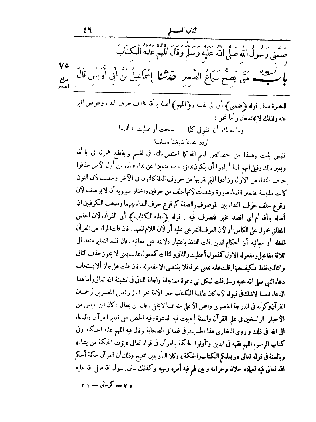 فليس يثبت وهذا من خصائص اسم الله كما اختص بالتاء في القسم وبقطع همزته في يا الله وبغير ذلك وقيل إنهم لما أرادوا أن يكون نداؤه باسمه متميزا عن نداء عباده من أول الأمر حذفوا حرف النداء من الأول وزادوا الميم لقربها من حروف العلة كالنون في الآخر وخصت لأن النون كانت ملتبسة بضمير النساء صورة وشددت لأنها خلف من حرفين واختار سيبويه أن لا يوصف لأن وقوع خلف حرف النداء بين الموصوف والصفة كوقوع حرف النداء بينهما ومذهب الكوفيين أن أصله يا الله أم أي أقصد بخير فتصرف فيه. قوله (علمه الكتاب) أي القرآن لأن الجنس المطلق محمول علي الكامل أو لأن العرف الشرعي عليه أو لأن اللام للعهد. فأن قلت المراد من القرآن لفظه أو معانيه أو أحكام الدين. قلت اللفظ باعتبار دلالته علي معانيه. فأن قلت التعليم متعد إلى ثلاثة مفاعيل ومفعوله الأول كمفعول أعطيت والثاني والثالث كمفعول علمت يعني لا يجوز حذف الثاني والثالث فقط فكيف ههنا. قلت علمه بمعني عرفه فلا يقتضي إلا مفعوله. فأن قلت هل جاز ألا يستجاب دعاء النبي صلي الله عليه وسلم. قلت لكل نبي دعوة مستجابة وإجابة الباقي في مشيئة الله تعالي وأما هذا الدعاء فمما لا شك في قبوله لأنه كان عالما بالكتاب حبر الأمة نحو العلم رئيس المفسرين وترجمان القرآن وكونه في الدرجة القصوى والمحل الأعلى منه مما لا يخفي. قال ابن بطال: كان ابن عباس من الأحبار الراسخين في علم القرآن والسنة أحببت فيه الدعوة وفيه الحض على تعليم القرآن والدعاء إلى الله في ذلك وروي البخاري هذا الحديث في فضائل الصحابة وقال فيه اللهم علمه الحكمة وفي كتاب الوضوء اللهم فقهه في الدين وتأولوا الحكمة بالقرآن في قوله تعالي «يؤت الحكمة من يشاء» وبالسنة في قوله تعالي «ويعلمكم الكتاب والحكمة» وكلا التأويلين صحيح وذلك أن القرآن حكمة أحكم الله تعالي فيه لعباده حلاله وحرامه وبين لهم فيه أمره ونهيه وكذلك سنن رسول الله صلي الله عليه
