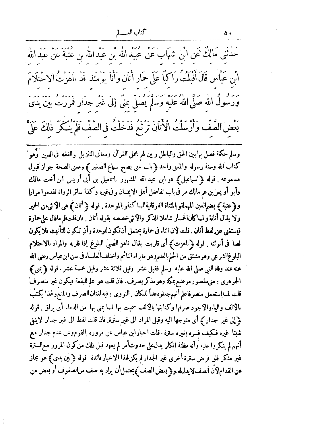 وسلم حكمة فصل بها بين الحق والباطل وبين لهم بحمل القرآن ومعاني التنزيل والفقه في الدين وهو كتاب الله وسنة رسوله والمعني واحد (باب متى يصح سماع الصغير) ومعني الصحة جواز قبول مسموعة. قوله (إسماعيل) هو ابن عبد الله المشهور باسمعيل بن أبي أويس ابن أخت مالك وأبو أويس بن عم مالك مر في باب تفاضل أهل الإيمان وفي غيره وكذا سائر الرواة تقدموا مرارا و (عتبة) بضم العين المهملة وبالمثناة الفوقانية الساكنة بالموحدة. قوله (أتان) هي الأنثي من الحمير ولا يقال أتانة ولما كان الحمار شاملا للذكر والأنثى خصصه بقوله أتان. فإن قلت فلم ما قال علي حمارة فيستغني عن لفظ أتان. قلت لأن التاء في حمارة يحتمل أن تكون للوحدة وأن تكون للتأنيث فلا يكون نصا في أنوثته. قوله (ناهزت) أي قاربت يقال ناهز الصبي البلوغ إذا قاربه والمراد بالاحتلام البلوغ الشرعي وهو مشتق من الحلم بالضم وهو ما يراه النائم واختلف العلماء في سن ابن عباس رضي الله عنه عند وفاة النبي صلي الله عليه وسلم فقيل عشر وقيل ثلاثة عشر وقيل خمسة عشر. قوله (بمني) الجوهري: مني مقصور موضع بمكة وهو مذكر يصرف. فإن قات هو علم للبقعة فيكون غير منصرف قلت لما استعمل منصرفا فاعلم أنهم جعلوه علما للمكان. النووي: فيه لغتان الصرف والمنع ولهذا يكتب بالألف والياء الأجود صرفها وكتائبها بالألف سميت بها لما يمني بها من الدماء لأي يراق. قوله (إلى عير جدار) أي متوجها إليه وقيل المراد إلى غير سترة. فإن قلت لفظ إلى غير جدار لا ينفي شيئا غيره فكيف فسره بغيره سترة. قلت أخبار ابن عباس عن مروره بالقوم وعن عدم جدار مع أنهم لم ينكروا عليه وأنه مظنة إنكار يدل علي حدوث أمر لم يعهد قبل ذلك من كون المرور مع السترة غير منكر فلو فرض سترة أخري غير الجدار لم يكن لهذا الإخبار فائدة قوله (بين يدي) هو مجاز عن القدام لأن الصف لا يدل له. و (بعض الصف) يحتمل أن يراد به صف من الصفوف أو بعض من