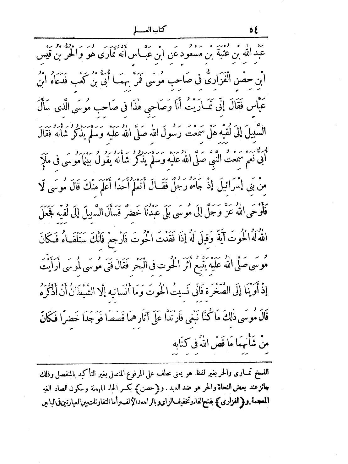 عَبْدِ اللَّهِ بْنِ عُتْبَةَ بْنِ مَسْعُودٍ عَنِ ابْنِ عَبَّاسٍ أَنَّهُ تَمَارَى هُوَ وَالْحُرُّ بْنُ قَيْسِ بْنِ حِصْنٍ الْفَزَارِىُّ فِى صَاحِبِ مُوسَى، فَمَرَّ بِهِمَا أُبَىُّ بْنُ كَعْبٍ، فَدَعَاهُ ابْنُ عَبَّاسٍ فَقَالَ إِنِّى تَمَارَيْتُ أَنَا وَصَاحِبِى هَذَا فِى صَاحِبِ مُوسَى الَّذِى سَأَلَ السَّبِيلَ إِلَى لُقِيِّهِ، هَلْ سَمِعْتَ رَسُولَ اللَّهِ صلى الله عليه وسلم يَذْكُرُ شَانَهُ فَقَالَ أُبَىٌّ نَعَمْ، سَمِعْتُ النَّبِىَّ صلى الله عليه وسلم يَذْكُرُ شَانَهُ يَقُولُ «بَيْنَمَا مُوسَى فِى مَلإٍ مِنْ بَنِى إِسْرَائِيلَ، إِذْ جَاءَهُ رَجُلٌ فَقَالَ أَتَعْلَمُ أَحَداً أَعْلَمَ مِنْكَ قَالَ مُوسَى لاَ. فَأَوْحَى اللَّهُ عَزَّ وَجَلَّ إِلَى مُوسَى بَلَى، عَبْدُنَا خَضِرٌ، فَسَأَلَ السَّبِيلَ إِلَى لُقِيِّهِ، فَجَعَلَ اللَّهُ لَهُ الْحُوتَ آيَةً، وَقِيلَ لَهُ إِذَا فَقَدْتَ الْحُوتَ فَارْجِعْ، فَإِنَّكَ سَتَلْقَاهُ، فَكَانَ مُوسَى صلى الله عليه وسلم يَتَّبِعُ أَثَرَ الْحُوتِ فِى الْبَحْرِ. فَقَالَ فَتَى مُوسَى لِمُوسَى أَرَأَيْتَ إِذْ أَوَيْنَا إِلَى الصَّخْرَةِ فَإِنِّى نَسِيتُ الْحُوتَ، وَمَا أَنْسَانِيهِ إِلاَّ الشَّيْطَانُ أَنْ أَذْكُرَهُ. قَالَ مُوسَى ذَلِكَ مَا كُنَّا نَبْغِى. فَارْتَدَّا عَلَى آثَارِهِمَا قَصَصاً، فَوَجَدَا خَضِرًا، فَكَانَ مِنْ شَانِهِمَا مَا قَصَّ اللَّهُ فِى كِتَابِهِ»