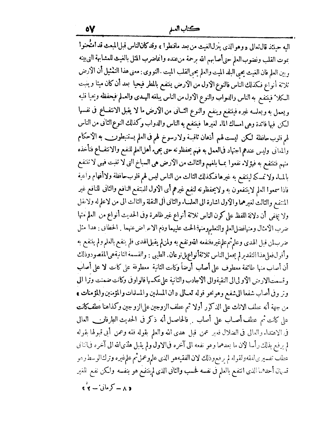 إليه حينئذٍ قال تعالى: (وهو الذي ينزل الغيث من بعد ما قنطوا) وقد كان الناس قبل المبعث قد امتُحنوا بموت القلب ونضوب العلم حتى أصابهم الله برحمة من عنده وإنما ضرب المثل بالغيث للمشابهة التي بينه وبين العلم فإن الغيث يحيي البلد الميت والعلم يحيي القلب الميت. النووي: معنى هذا التمثيل أن الأرض ثلاثة أنواع فكذلك الناس فالنوع الأول من الأرض ينتفع بالمطر فيحيا بعد أن كان ميتاً وينبت الكلأ فينتفع به الناس والدواب والنوع الأول من الناس يبلغه الهدى والعلم فيحفظه ويحيى قلبه ويعمل به ويعلمه غيره فينتفع وينفع والنوع الثاني من الأرض ما لا يقبل الانتفاع في نفسها لكن فيها فائدة وهي إمساك الماء لغيرها فينتفع به الناس والدواب وكذلك النوع الثاني من الناس لهم قلوب حافظة لكن ليست لهم أذهان ثاقبة ولا رسوخ لهم في العلم يستنبطون به الأحكام والمعاني وليس عندهم اجتهاد في العمل به فهم يحفظونه حتى يجيء أهل العلم للنفع والانتفاع فتأخذه منهم فتنتفع به فهؤلاء نفعوا بما بلغهم والثالث من الأرض هي السباغ التي لا تنبت فهي لا تنتفع بالماء ولا تمسكه لينتفع به غيرها فكذلك الثالث من الناس ليس لهم قلوب حافظة ولا أفهام واعية فإذا سمعوا العلم لا ينتفعون به ولا يحفظونه لنفع غيرهم أي الأول للمنتفع النافع والثاني للنافع غير المنتفع والثالث لغيرهما والأول إشارة إلى العلماء والثاني إلى النقلة والثالث إلى من لا علم له ولا نقل ولا يخفى أن دلالة اللفظ على كون الناس ثلاثة أنواع غير ظاهرة وفي الحديث أنواع من العلم منها ضرب الأمثال ومنها فضل العلم والتعليم ومنها الحث عليهما وذم الأعراض عنهما. الخطابي: هذا مثل ضرب لمن قبل الهدى وعلم ثم علم غيره فنفعه الله ونفع به ولمن لم يقبل الهدى فلم ينفع بالعلم ولم ينتفع به وأقول فعلى هذا التقدير لم يجعل الناس ثلاثة أنواع بل نوعان. الطيبي: والقسمة الثانية هي المقصود وذلك أن أصاب منها طائفة معطوف على أصاب أرضاً وكانت الثانية معطوفة على كانت لا على أصاب وقسمت الأرض الأولى إلى النقبة وإلى الأجادب والثانية على عكسها قالوا وفي وكانت ضمنت وتراً إلى وتر وفي أصاب شفعاً إلى شفع وهو نحو قوله تعالى: (أن المسلمين والمسلمات والمؤمنين والمؤمنات) من جهة أنه خطف الإناث على الذكور أولاً ثم عطف الزوجين على الزوجين وكذا هنا عطف كانت على كانت ثم عطف أصاب على أصاب. فالحاصل أنه ذكر في الحديث الطرفان العالي في الاهتداء والعالي في الضلال فعبر عمن قبل هدى الله والعلم بقوله فقه وعمن أبى قبولها بقوله لم يرفع بذلك رأساً لأن ما بعدهما وهو نفعه إلى آخره في الأول ولم يقبل هدى الله إلى آخره في الثاني عطف تفسيري لفقه ولقوله لم يرفع وذلك لأن الفقيه هو الذي علم وعمل ثم علم غيره وترك الوسط وهو قسماته أحدهما الذي انتفع بالعلم في نفسه فحسب والثاني الذي لم ينتفع هو بنفسه ولكن نفع الغير