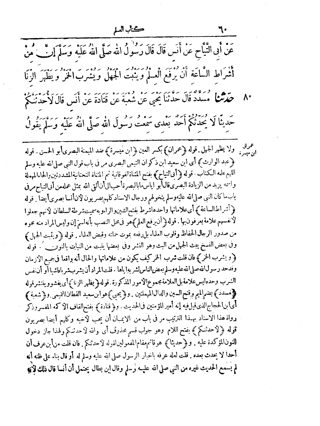 ولا يظهر الجهل. قوله (عمران) بكسر العين (ابن ميسرة) ضد الميمنة البصري أبو الحسن. قوله (عبد الوارث) أي ابن سعيد ابن ذكوان التيمي البصري مر في باب قول النبي صلى الله عليه وسلم اللهم علمه الكتاب. قوله (أبي النياح) بفتح المثناة الفوقانية ثم المثناة التحتانية المشددتين والحاء المهملة واسمه يزيد من الزيادة البصري قال أبو إياس ما بالبصرة أحب إلى أن ألقى الله بمثل عمله من أبي النياح مر في باب ما كان النبي صلى الله عليه وسلم يتخولهم ورجال الإسناد كلهم بصريون لأن أنا بصري أيضاً. قوله (أشراط الساعة) أي علاماتها واحدها شرط بفتح الشين والراء وبه سميت شرطة السلطان لأنهم جعلوا لأنفسهم علامة يعرفون بها. قوله (أن يرفع العلم) هو في محل النصب بأنه اسم إن وليس المراد منه نحوه من صدور الرجال الحفاظ وقلوب العلماء بل رفعه بموت حملته وقبض العلماء. قوله (ويثبت الجهل) وفي بعض النسخ يبث الجهل من البث وهو النشر وفي بعضها ينبت في النبات بالنون. قوله (ويشرب الخمر) فإن قلت شرب الخمر كيف يكون من علاماتها والحال أنه واقعاً في جميع الأزمان وقد حد رسول الله صلى الله عليه وسلم بعض الناس لشربه إياها. قلت المراد أن يشرب شرباً فاشياً أو أن نفس الشرب وحده ليس علامة بل العلامة مجموع الأمور المذكورة. قوله (يظهر الزنا) أي يفشو وينتشر قوله (مسدد) بضم الميم وفتح السين والدال المهملتين. و (يحيى) هو ابن سعيد القطان التميمي. و (شعبة) أي ابن الحجاج الذي قيل فيه إنه أمير المؤمنين في الحديث. و (قتادة) بفتح القاف الأكمة المفسر وذكر رواة هذا الإسناد بهذا الترتيب مر في باب من الإيمان أن يحب لأخيه وكلهم أيضاً يضربون قوله (لأحدثنكم) بفتح اللام وهو جواب قسم محذوف أي والله لأحدثنكم ولهذا جاز دخول النون المؤكدة عليه. و (حديثاً) هو قائم مقام المفعولين لقوله لأحدثنكم. فإن قلت من أين عرف أن أحداً لا يحدث بعده. قلت لعله عرفه بأخبار الرسول صلى الله عليه وسلم له أو قال بناء على ظنه أنه لم يسمع الحديث غيره من النبي صلى الله عليه وسلم وقال ابن بطال يحتمل أن أنساً قال ذلك لأنه