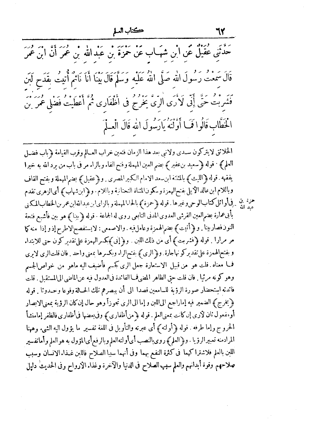 حَدَّثَنِى عُقَيْلٌ عَنِ ابْنِ شِهَابٍ عَنْ حَمْزَةَ بْنِ عَبْدِ اللَّهِ بْنِ عُمَرَ أَنَّ ابْنَ عُمَرَ قَالَ سَمِعْتُ رَسُولَ اللَّهِ صلى الله عليه وسلم قَالَ «بَيْنَا أَنَا نَائِمٌ أُتِيتُ بِقَدَحِ لَبَنٍ، فَشَرِبْتُ حَتَّى إِنِّى لأَرَى الرِّىَّ يَخْرُجُ فِى أَظْفَارِى، ثُمَّ أَعْطَيْتُ فَضْلِى عُمَرَ بْنَ الْخَطَّابِ». قَالُوا فَمَا أَوَّلْتَهُ يَا رَسُولَ اللَّهِ قَالَ «الْعِلْمَ».