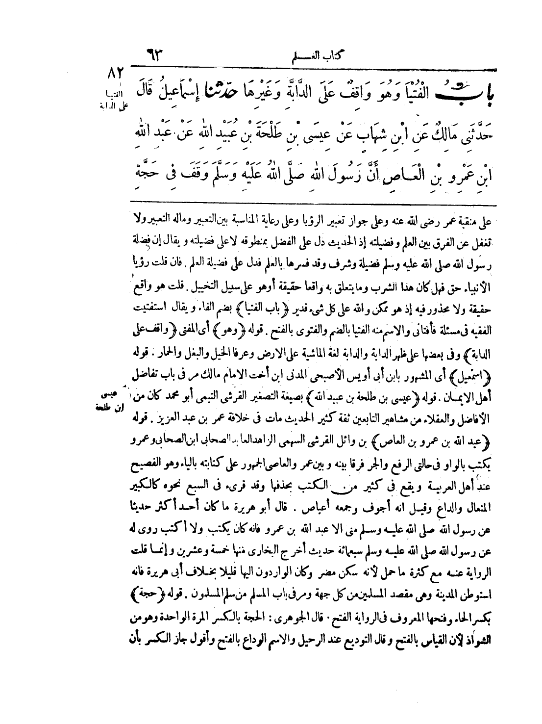 82 - حَدَّثنا إِسْمَاعِيلُ، قَالَ: حَدَّثَنِي مَالِكٌ، عَنِ ابْنِ شِهَابٍ، عَنْ عِيسَى بْنِ طَلْحَةَ بْنِ عُبَيْدِ اللهِ، عَنْ عَبْدِ اللهِ بْنِ عَمْرِو بْنِ العَاصِ، أَنَّ رَسُولَ اللهِ صَلى الله عَلَيهِ وسَلمَ وَقَفَ فِي حَجَّةِ