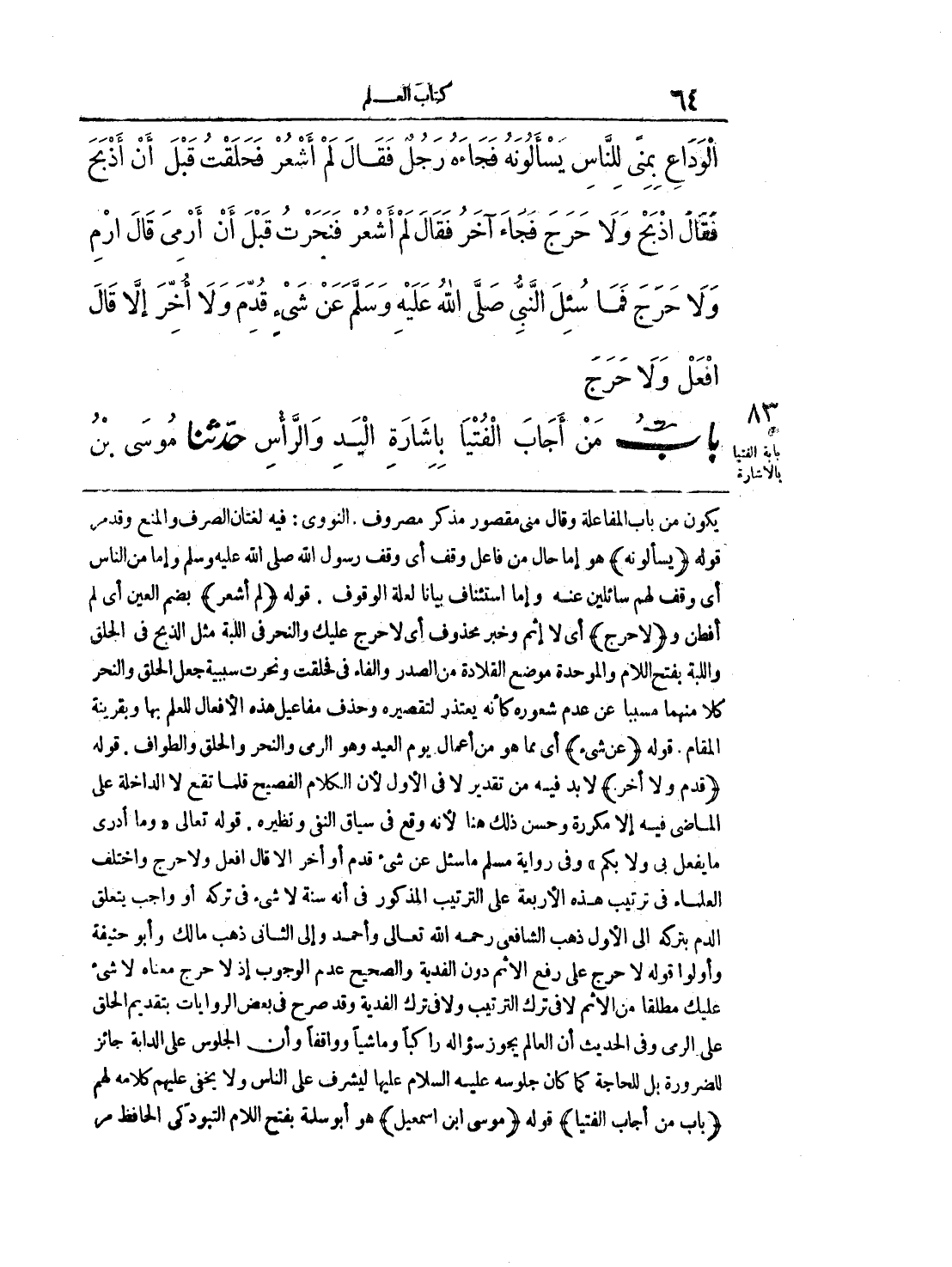 يكون من باب المفاعلة وقال مني مقصور مذكر مصروف. النووي: فيه لغتان الصرف والمنع وقد مر قوله (يسألونه) هو إما حال من فاعل وقف أي وقف رسول الله صلى الله عليه وسلم وإما من الناس أي وقف لهم سائلين عنه وإما استئناف بياناً لعلة الوقوف. قوله (لم أشعر) بضم العين أي لم أفطن و (لا حرج) أي لا إثم وخبر محذوف أي لا حرج عليك والنحر في اللبة مثل الذبح في الحلق واللبة بفتح اللام والموحدة موضع القلادة من الصدر والفاء في فخلقت ونحرت سببية جعل الحلق والنحر كلاً منهما مسبباً عن عدم شعوره كأنه يعتذر لتقصيره وحذف مفاعيل هذه الأفعال للعلم بها وبقرينة المقام. قوله (عن شئ) أي مما هو من أعمال يوم العيد وهو الرمي والنحر والحلق والطواف. قوله (قدم ولا أخر) لابد فيه من تقدير لا في الأول لأن الكلام الفصيح قلما تقع لا الداخلة على الماضي فيه إلا مكررة وحسن ذلك هنا لأنه وقع في سياق النفي ونظيره. قوله تعالى (وما أدري ما يفعل بي ولا بكم) وفي رواية مسلم ما سئل عن شيء قدم أواخر إلا قال افعل ولا حرج واختلف العلماء في ترتيب هذه الأربعة على الترتيب المذكور في أنه سنة لا شيء في تركه أو واجب يتعلق الدم بتركه إلى الأول ذهب الشافعي رحمه الله تعالى وأحمد وإلى الثاني ذهب مالك وأبو حنيفة وأولو قوله لا حرج على رفع الإثم دون الفدية والصحيح عدم الوجوب إذ لا حرج معناه لا شيء عليك مطلقاً من الإثم لا في ترك الترتيب ولا في ترك الفدية وقد صرح في بعض الروايات بتقديم الحلق على الرمي وفي الحديث أن العالم يجوز سؤاله راكباً وماشياً وواقفاً وأن الجلوس على الدابة جائز للضرورة بل للحاجة كما كان جلوسه عليه السلام عليها ليشرف على الناس ولا يخفى عليهم كلامه لهم (باب من أجاب الفتيا) قوله (موسى ابن إسمعيل) هو أبو سلمة بفتح اللام التبودكي الحافظ مر