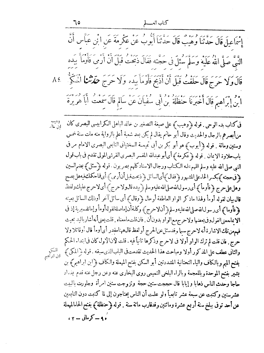 في كتاب بدء الوحي. قوله (وهيب) على صيغة التصغير بن خالد الباهلي الكرابيسي البصري كان من أبصرهم بالرجال والحديث وقال أبو حاتم يقال لم يكن بعد شعبة أعلم بالرواية منه مات سنة خمس وستين ومائة. قوله (أيوب) هو أبو بكر بن أبي تميمة السختياني التابعي البصري الإمام مر في باب حلاوة الإيمان. قوله (عكرمة) أي أبو عبد الله المفسر البصري القرشي المولى تقدم في باب قول النبي صلى الله عليه وسلم اللهم علمه الكتاب ورجال الإسناد كلهم بصريون. قوله (سئل) بضم السين (في حجته) بكسر الحاء على المشهور (فقال) أي السائل (ذبحت قبل أن أرمي) أي فما حكمك فيه هل يصح وهل على حرج (فأومأ) أي رسول الله صلى الله عليه وسلم (بيده قال ولا حرج) أي لا حرج عليك ولفظ قال بيان لقوله أومأ ولهذا ما ذكر الواو العاطفة أو حال (وقال) أي سائل آخر أو ذلك السائل بعينه (فأومأ) أي رسول الله صلى الله عليه وسلم (أن لا حرج) وكلكمة أن إما صلة لقوله أومأ وإما تفسيرية إذ في الإيماء معنى القول وفي بعضها ولا حرج مع الواو بدون أن. فإن قلت ما معناه. قلت يعني أنه أشار باليد بحيث فهم من تلك الإشارة أنه لا حرج سيما وقد سئل عن الحرج أو لفظ قال ههنا مقدر أي أومأ قال أو قائلاً ولا حرج. فإن قلت لم ترك الواو أولاً في لا حرج وذكرها ثانياً فيه. قلت لأن الأول كان في ابتداء الحكم والثاني عطف على المذكور أولاً ومباحث هذا الحديث تقدمت في الباب الذي سبقه. قوله (المكي) بفتح الميم وبالكاف والياء التحتانية المشددتين أو السكن بفتح المهملة والكاف (ابن إبراهيم) بن بشير بفتح الموحدة وبالمعجمة وبالراء البلخي التميمي روى البخاري عنه وعن رجل عنه قدم بغداد حاجاً وحدث الناس ذهاباً وإياباً قال حججت ستين حجة وتزوجت ستين امرأة وجاورت بالبيت عشر سنين وكتبت عن سبعة عشر تابعياً ولو علمت أن الناس يحتاجون إلى لما كتبت دون التابعين عن أحد توفي ببلخ سنة أربع عشرة ومائتين وقد قارب مائة سنة. قوله (حنظلة) بفتح الحاء المهملة