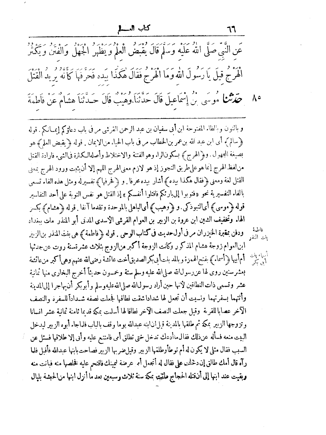 وبالنون وبالظاء المفتوحة ابن أبي سفيان بن عبد الرحمن القرشي مر في باب دعاؤكم إيمانكم. قوله (سالم) أي ابن عبد الله بن عمر بن الخطاب مر في باب الحياء من الإيامن. قوله (يقبض العلم) هو بصيغة المجهول. و (الهرج) بسكون الراء وهو الفتنة والاختلاط وأصله الكثرة في الشيء فإرادة القتل من لفظ الهرج إنما هو على طريق التجوز إذ هو لازم معنى الهرج اللهم إلا أن يثبت ورود الهرج بمعنى القتل لغةً ومعنى (فقال هكذا بيده) أشار بيده محرفاً. و (فحرفها) تفسير له ومثل هذه الفاء تسمى بالفاء التفسيرية نحو "فتوبوا إلى بارئكم فاقتلوا أنفسكم" إذ القتل هو نفس التوبة على أحد التفاسير قوله (موسى) أي التبوذكي، و (وهيب) أي الباهلي بالموحدة وتقدما آنفاً. قوله (هشام) بكسر الهاء وتخفيف الشين ابن عروة بن الزبير بن العوام القرشي الأسدي المدني أبو المنذر مات ببغداد ودفن بمقبرة الخيزران مر في أول حديث في كتاب الوحي. قوله (فاطمة) هي بنت المنذر بن الزبير ابن العوام زوجة هشام المذكور وكانت الزوجة أكبر من الزوج بثلاث عشرة سنة روت عن جدتها أم أبيها (أسماء) بفتح الهمزة وبالمد بنت أبي بكر الصديق أخت عائشة رضي الله عنهم وهي أكبر من عائشة بعشر سنين روى لها عن رسول الله صلى الله عليه وسلم ستة وخمسون حديثاً أخرج البخاري منها ثمانية عشر وتسمى ذات النطاقين لأنها حين أراد رسول الله صلى الله عليه وسلم وأبو بكر أن يهاجرا إلى المدينة وأئتهما بسفرتهما ونسيت أن تجعل لها شداداً شقت نطاقها فجعلت نسفه شداداً للسفرة والنصف الآخر عصاباً للقربة وقيل جعلت النصف الآخر نطاقاً لها أسلمت بمكة قديماً ثامنة ثمانية عشرة إنساناً وتزوجها الزبير بمكة ثم طلقها بالمدينة قيل أن ابنه عبد الله يوماً وقف بالباب فلما جاء أبوه الزبير ليدخل البيت منعه فسأله عن ذلك فقال ما أدعك تدخل حتى تطلق أمي فامتنع عليه وأبى إلا طلاقها فسئل عن السبب فقال مثلي لا يكون له أم توطأ وطلعتها الزبير وقيل ضربها الزبير فصاحت بابنها عبد الله فأقبل فلما رآه قال أمك طالق إن دخلت علي فقال له أتجعل أمي عرضة ليمينك فاقتحم عليه فخلصها منه فبانت منه وبقيت عند ابنها إلى أن قتله الحجاج ماتت بمكة سنة ثلاث وسبعين بعد ما أنزل ابنها من الحبشة بليال
