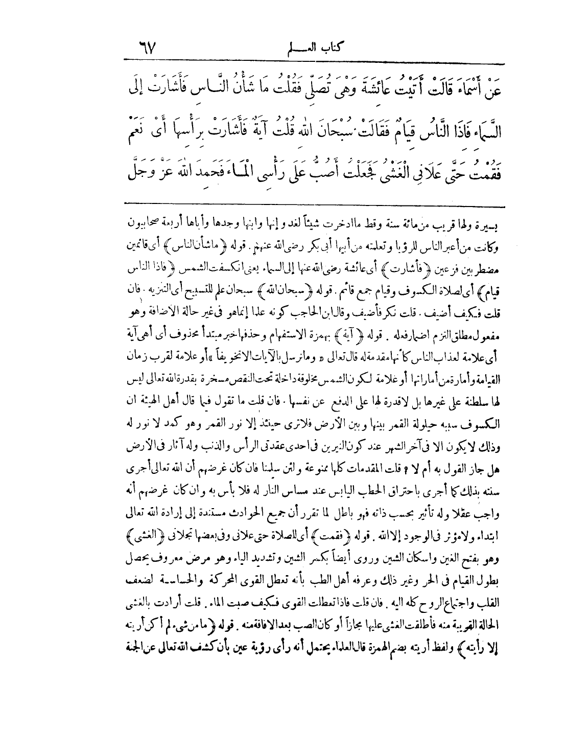 عَنْ أَسْمَاءَ قَالَتْ أَتَيْتُ عَائِشَةَ وَهِىَ تُصَلِّى فَقُلْتُ مَا شَانُ النَّاسِ فَأَشَارَتْ إِلَى السَّمَاءِ، فَإِذَا النَّاسُ قِيَامٌ، فَقَالَتْ سُبْحَانَ اللَّهِ. قُلْتُ آيَةٌ فَأَشَارَتْ بِرَاسِهَا، أَىْ نَعَمْ، فَقُمْتُ حَتَّى تَجَلاَّنِى الْغَشْىُ، فَجَعَلْتُ أَصُبُّ عَلَى رَاسِى الْمَاءَ، فَحَمِدَ اللَّهَ عَزَّ وَجَلَّ