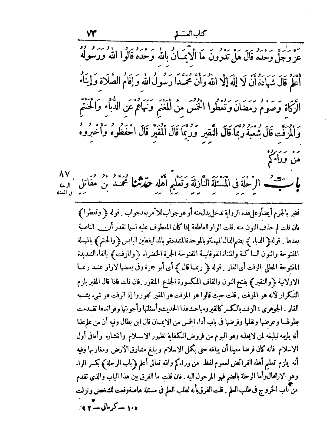 نخبر بالجزم أيضا وعلى هذه الرواية ندخل بدل منه أو هو جواب للأمر بعد جواب. قوله (وتعطلوا) فإن قلت لم حذف النون منه. قلت الواو العاطفة إذا كان المعطوف عليه اسما تقدر أن الناصبة بعدها. قوله (الدباء) بضم الدال المهملة وبالموحدة المشددة وبالد اليقطين اليابس (والخنثم) بالمهملة المفتوحة والنون الساكنة والمثناة الفوقانية المفتوحة الجرة الخضراء (والمزفت) بالفاء الشديدة المفتوحة المطلي بالزفت أي القار، قوله (ربما قال) أي أبو جمرة وفي بعضها لاواو عند ربما الاولانية (والنقير) بفتح النون والقاف المكسورة الجذع المنقور. فإن قلت فاذا قال المقير يلزم التكرار لأنه هو المزفت. قلت حيث قالوا هو المزفت هو المقير تجوزوا إذ الزفت هو شيء يشبه القار. الجوهري: الزفت بالكسر كالقير ومباحث هذا الحديث وأسئلتها وأجوبتها وفوائدها تقدمت بطولها وعرضها ونفلها وفرضها في باب أداء الخمس من الإيمان قال ابن بطال وفيه أن من علم علما انه يلزمه تبليغه لمن لا يعلمه وهو اليوم من فروض الكفاية لظهور الإسلام وانتشاره وأما في أول الإسلام فإنه كان فرضا معينا أن يبلغه حتي يكمل الإسلام ويبلغ مشارق الأرض ومغاربها وفيه أنه يلزم تعليم أهله الفرائض لعموم لفظ من وراءكم والله تعالي أعلم (باب الرحلة) بكسر الراء وهو الإرتحال وأما الرحلة بالضم فهو المرحول إليه. فإن قلت ما الفرق بين هذا الباب والذي تقدم من باب الخروج في طلب العلم. قلت الفرق بأنه لطلب العلم في مسئلة خاصة وقعت للشخص ونزلت