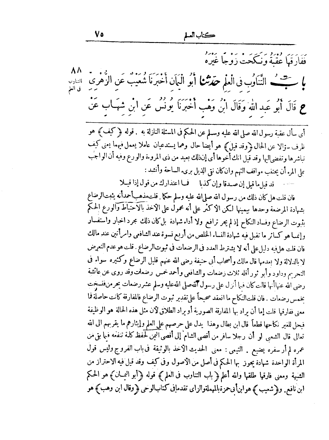 88 - حَدَّثَنَا أَبُو الْيَمَانِ أَخْبَرَنَا شُعَيْبٌ عَنِ الزُّهْرِىِّ ح قَالَ أَبُو عَبْدِ اللَّهِ وَقَالَ ابْنُ وَهْبٍ أَخْبَرَنَا يُونُسُ عَنِ ابْنِ شِهَابٍ عَنْ