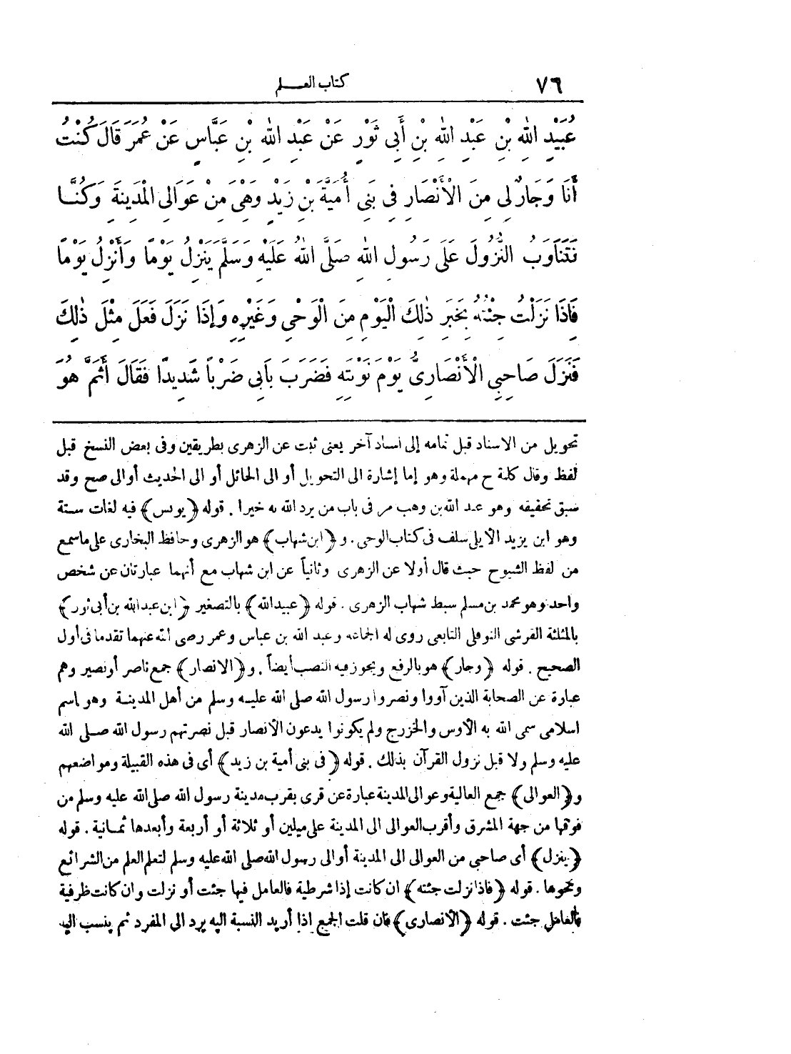 تحويل من الإسناد قبل إمامه إلي اسناد آخر يعني ثبت عن الزهري بطريقتين وفي بعض انسخ قبل لفظ وقال كلمة ح مهملة وهو إما إشارة إلي التحويل أو إلي الحائل أو إلي الحديث أو إلي صح وقد سبق تحقيقه وهو عبد الله بن وهب مر في باب من يرد الله به خيرا. قوله (يونس) فيه لغات ستة وهو ابن يزيد الأيملي سلف في كتاب الوحي. و (ابن شهاب) هو الزهري وحافظ البخاري علي ماسمع من لفظ الشيوح حيث قال أولا عن الزهري وثانيا عن ابن شهاب مع أنهما عبارتان عن شخص واحد وهو محمد بن مسلم سبط شهاب الزهري. قوله (عبيد الله) بالتصغير (ابن عبد الله بن أبي نور) بالمثلثة القرشي النوعلي التابعي روي له الجماعة وعبد الله بن عباس وعمر رضي اله عنهما تقدما في أول الصحيح. قوله (وجار) هو بالرفع ويجوز فيه النصب أيضا. و (الأنصار) جمع ناصر أو نصير وهم عبارة عن الصحابة الذين آووا ونصروا رسول اله صلي الله عليه وسلم من أهل المدينة وهو إسم إسلامي سمي اله به الأوس والخزرج ولم يكونوا يدعون الأنصار قبل نصرتهم رسول الله صلي الله عليه وسلم ولا قبل نزول القرآن بذالك. قوله (في بني أمية بن زيد) أي في هذه القبيلة ومواضعهم و (العوالي) جمع العالية وعوالي المدينة أو إلي رسوا الله صلي الله عليه وسلم لتعلم العلم من الشرائع ومحوها. قوله (فإذا نزلت جئته) إن كانت إذا شرطية فالعامل فيها جئت أو نزلت وإن كانت ظرفية فالعامل جئت. قوله (الأنصاري) فإن قلت الجمع إذا أريد النسبة إليه يرد إلي المفرد ثم ينسب إلي