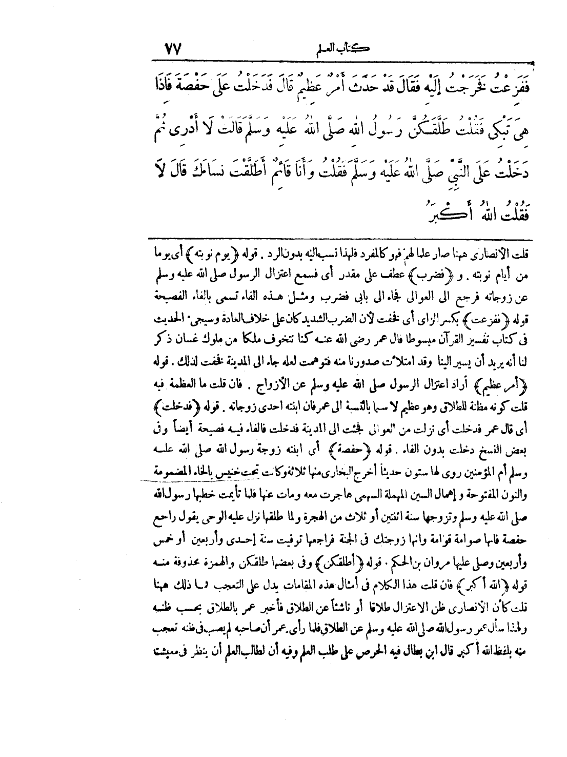 قلت الأنصاري همنا صار علما لهم فهو كالمفرد فلهذا نسبه إليه بدون الرد. قوله (يوم وبته) أي يوما من أيام نوبته. و (فضرب) عطف علي مقدر أي فسمع اعتزال الرسول صلي الله عليه وسلم عن زوجاته فرجع إلي العوالي فجاء إلي بابي فضرب ومثل هذه الفاء تسمي بالفاء الفصيحة قوله (ففزعت) بكسر الزاي أي فخفت لأن الضرب الشديد كان علي خلاف العادة وسيجيء الحديث في كتاب تفسير القرآن مبسوطا قال عمر رضي الله عنه كنا نتخوف ملكا من ملوك غسان ذكر لنا أنه يريد يسير إلينا وقد امتلأت صدورنا منه فتوهمت لعله جاء إلي المدينة فخفت لذلك. قوله (أمر عظيم) أراد اعتزال الرسول صلي الله عليه وسلم عن الأزواج. فإن قلت ما العظمة فيه قلت كونه مظنة للطلاق وهو عظيم لاسيما بالنسبة إلي عمر فإن ابنته احدي زوجاته. قوله (فدخلت) أي قال عمر فدخلت أي نزلت من العوالي فجئت إلي المدينة فدخلت فالفاء فيه فصيحة أيضا وفي بعض النسخ دخلت بدون الفاء. قوله (حفصة) أي ابنته زوجة رسول الله صلي الله عليه وسلم أم المؤمنين روي لها ستون حديثا أخرج البخاري منها ثلاثة وكانت تحت خيس بالخاء المضمومة والنون المفتوحة وإهمال السين المهملة السهمي هاجرت معه ومات عنها فلما تأيمت خطبها رسول الله صلي الله عليه وسلم أم المؤمنين روي لها ستون حديثا أخرج البخاري منها ثلاثة وكانت تحت خيس بالخاء المضمومة والنون المفتوحة وإهمال السين المهملة السهمي هاجرت معه ومات عنها فلما تأيمت خطبها رسول الله صلي الله عليه وسلم وتزوجها سنة اثنتين أو ثلاث من الهجرة ولما طلقها نزل عليه الوحي يقول راحع حفصة فإنها صوامة قوامة وأنها زوجتك في الجنة فراجعها توفيت سنة احدي وأربعين أو خمس وأربعين وصلي عليها موان بن الحكم، قوله (أطلقكن) وفي بعضها طلقكن والهمزة محذوفة منه قوله (الله أكبر) فإن قلت هذا الكلام في أمثال هذه المقامات يدل علي التعجب فما ذلك همنا قلت كأن الأنصاري ظن الإعتزال طلاقا أو ناشئا عن الطلاق فأخبر عمر بالطلاق بحسب ظنه تعجب منه بلفظ الله أكبر قال ابن بطال فيه الحرص علي طلب العلم وفيه أن لطالب اعلم أن ينظر في معيشته