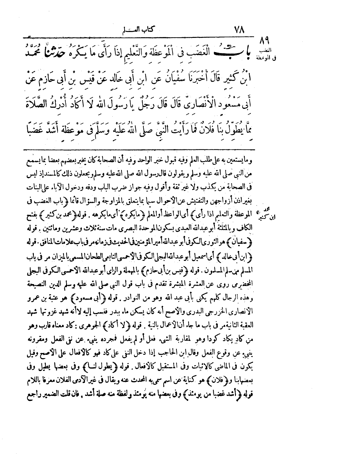 89 - حَدَّثَنَا مُحَمَّدُ بْنُ كَثِيرٍ قَالَ أَخْبَرَنَا سُفْيَانُ عَنِ ابْنِ أَبِى خَالِدٍ عَنْ قَيْسِ بْنِ أَبِى حَازِمٍ عَنْ أَبِى مَسْعُودٍ الأَنْصَارِىِّ قَالَ قَالَ رَجُلٌ يَا رَسُولَ اللَّهِ، لاَ أَكَادُ أُدْرِكُ الصَّلاَةَ مِمَّا يُطَوِّلُ بِنَا فُلاَنٌ، فَمَا رَأَيْتُ النَّبِىَّ صلى الله عليه وسلم فِى مَوْعِظَةٍ أَشَدَّ غَضَباً