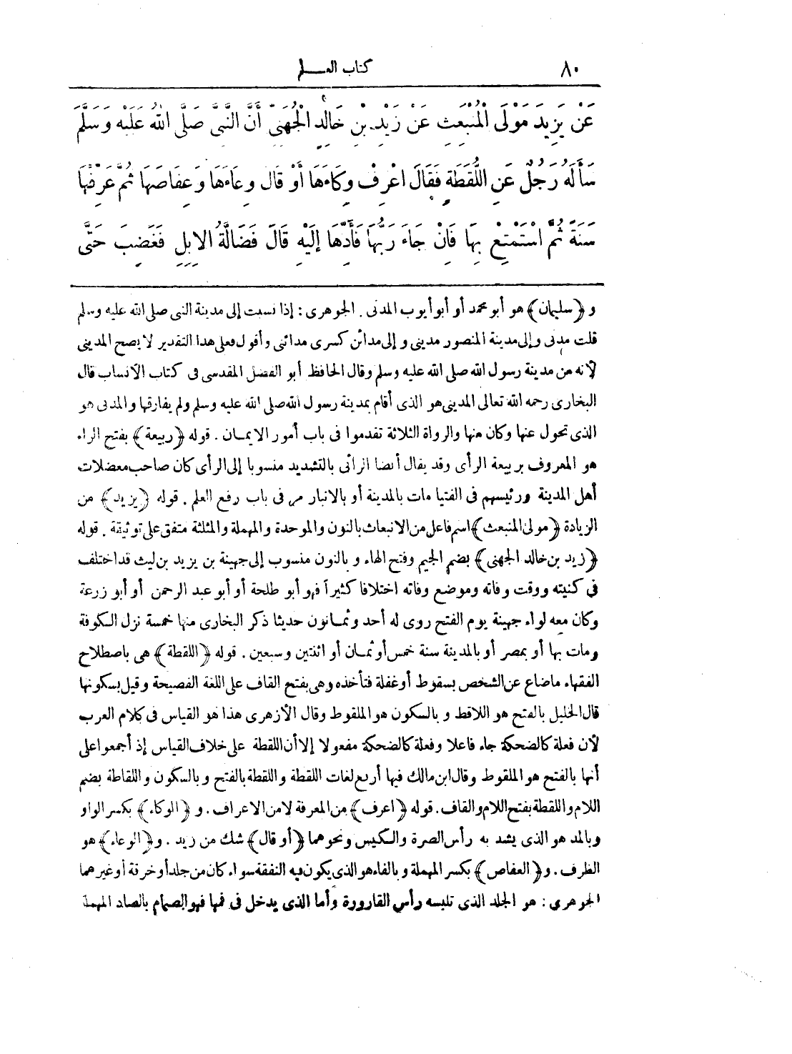 و (سليمان) هو أبو محمد أو أبو أبوب المدني الجوهري: إذا نسبت إلي مدينة النبي صلي الله عليه وسلم قلت مدني وإلي مدينة المنصور مديني وإلي مدائن كسري وأقول فعلي هذا التقدير لا يصبح المديني لأنه من مدينة رسول الله صلي الله عليه وسلم وقال الحافظ أبو الفضل المقدسي في كتاب الأنساب قال البخاري رحمه الله تعالي المديني هو الذي أقام بمدينة رسول الله صلي الله عليه وسلم ولم يفارقها والمدني هو الذي تحول عنها وكان منها والرواة الثلاثة تقدموا في باب أمور الإيمان. قوله (ربيعة) بفتح الراء هو المعروف بربيعة الرأي وقد يقال أيضا الرائي بالتشديد منسوبا إلي الرأي كان صاحب معضلات أهل المدينة ورئيسهم في الفتيا مات بالمدينة أو بالإنبار مر في باب رفع العلم. قوله (يزيد) من الزيادة (مولي المنبعث) اسم فاعل من الإنبعاث بالنون والموحدة المهملة والمثلثة متفق علي توثيقة. قوله (زيد بن خالد الجهني) بضم الجيم وفتح الهاء وبالنون منسوب إلي جهينة بن يزيد بن ليث قد اختلف في كنيته ووقت وفاته وموضع وفاته اختلافا كثيرا فهو أبو طلحة أو أبو عبد الرحمن أبو عبد الرحمن أو أبو زرعة وكان معه لواء جهينة يوم الفتح روي له أحد وثمانون حديثا ذكر البخاري منها خمسة نزل الكوفة ومات بها أو بمصر أو بالمدينة سنة خمس أو ثمان أو اثنتين وسبعين. قوله (اللقطة) هي باصطلاح الفقهاء ما ضاع عن الشخص بسقوط أو غفلة فتأخذه وهي بفتح القاف علي اللغة الفصيحة وقيل بسكونها قال الخليل بالفتح هو اللاقط وبالسكون هو الملقوط وقال الأزهري هذا هو القياس في كلام العرب لأن فعلة كالضحكة جاء فاعلا وفعلة كالضحكة مفعولا إلا أن اللقطة علي خلاف القياس إذ أجمعوا علي أنها بالفتح هو الملقوط وقال ابن مالك فيها أربع لغات اللقطة واللقطة بالفتح وبالسكون واللقاطة بضم اللام واللقطة بفتح اللام والقاف. قوله (اعرف) من المعرفة لا من الأعراف. و (الوكاء) بكسر الواو وبالمد هو الذي يشد به رأس الصرة والكيس ونحوهما (أو قال) شك من زيد. و (الوعاء) هو الظرف. و (العفاص) بكسر المهملة وبالفاء هو الذي يكون فيه النفقة سواء كان من جلد أو خرقة أو غيرهما الجوهري: هو الذي تلبسه رأس القارورة وأما يدخل في فمها فهو الصيام بالصاد المهملة