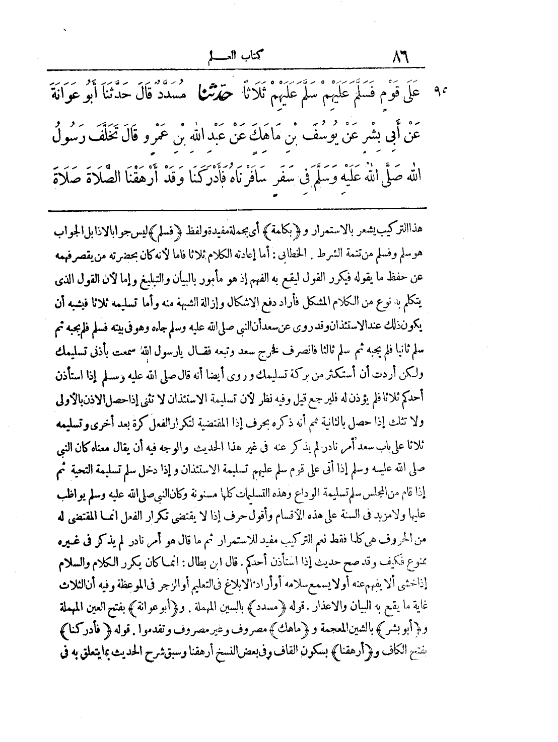 هذا التركيب يشعر بالاستمرار و (بكلمة) أي بجملة مفيدة ولفظ (فسلم) ليس جوابا لا ذابل الجواب هو سلم وفسلم من تتمة الشرط. الخطابي: أما إعادته الكلام ثلاثا فإما لأنه كان بحضرته من يقصر فهمه عن حفظ ما يقوله فيكرر القول ليقع به الفهم إذ هو مأمور بالبيان والتبليغ وإما لأن القول الذي يتكلم بن نوع من الكلام المشكل فأراد دفع الأشكال وإزالة الشبهة منه وأما تسليمه ثلاثا فيشبه أن يكون ذلك عند الإستئذان وقد روي عن سعد أن النبي صلي الله عليه وسلم جاءه وهو في بيته فسلم فلم يجبه ثم سلم ثانيا فلم يجبه ثم سله ثالثا فانصرف فخرج سعد وتبعه فقال يا رسول الله سمعت بأذني تسليمك ولكن أردت أن أستكثر من بركة تسليمك وروي أيضا أنه قال صلي الله عليه وسلم إذا استأذن أحدكم ثلاثا فلم يؤذن له فليرجع قيل وفيه نظر لأن تسليمة الإستئذان لا تثني إذا حصل الأذن بالأولي ولا تثلث إذا حصل بالثانية ثم أنه ذكره بحرف إذا المقتضية لتكرار الفعل كرة بعد أخري وتسليمه ثلاثا علي باب سعد أمر نادر لم يذكر عنه في غير هذا الحديث والوجه فيه أن يقال معناه كان النبي صلي الله عليه وسلم إذا أتي علي قوم سلم عليهم تسليمة الإستئذان وإذا دخل سلم تسليمة التحية ثم إذا قام من المجلس سلم تسليمة الوداع وهذه التسليمات كلها مسنونة م كان النبي صلي الله عليه وسلم يواظب عليها ولا مزيد في السنة علي هذه الأقسام وأقول حرف إذا لا يقتضي تكرار الفعل إنما المقتضي له من الحروف هي كلما فقط نعم التركيب مفيد للاستمرار ثم ما قال هو أمر نادر لم يذكر في غيره ممنوع فكيف وقد صح حديث إذا استأذن أحدكم. قال لبن بطال: إنما كان يكرر الكلام والسلام إذا خشي ألا يفهم عنه أولا يسمع سلامه أو أراد الإبلاغ في التعليم أو الزجر في الموعظة وفيه أن الثلاث غاية ما يقع به البيان والإعتذار. قوله (مسدد) بالسين المهملة. و (أبو عوانة) بفتح العين المهملة و (أبو بشر) بالشين المعجمة و (ماهك) مصروف وغير مصروف وتقدموا. قوله (فأدركنا) بفتح الكاف و (أرهقنا) بسكون القاف وفي بعض النسخ أرهقنا وسبق شرح الحديث بما يتعلق به في