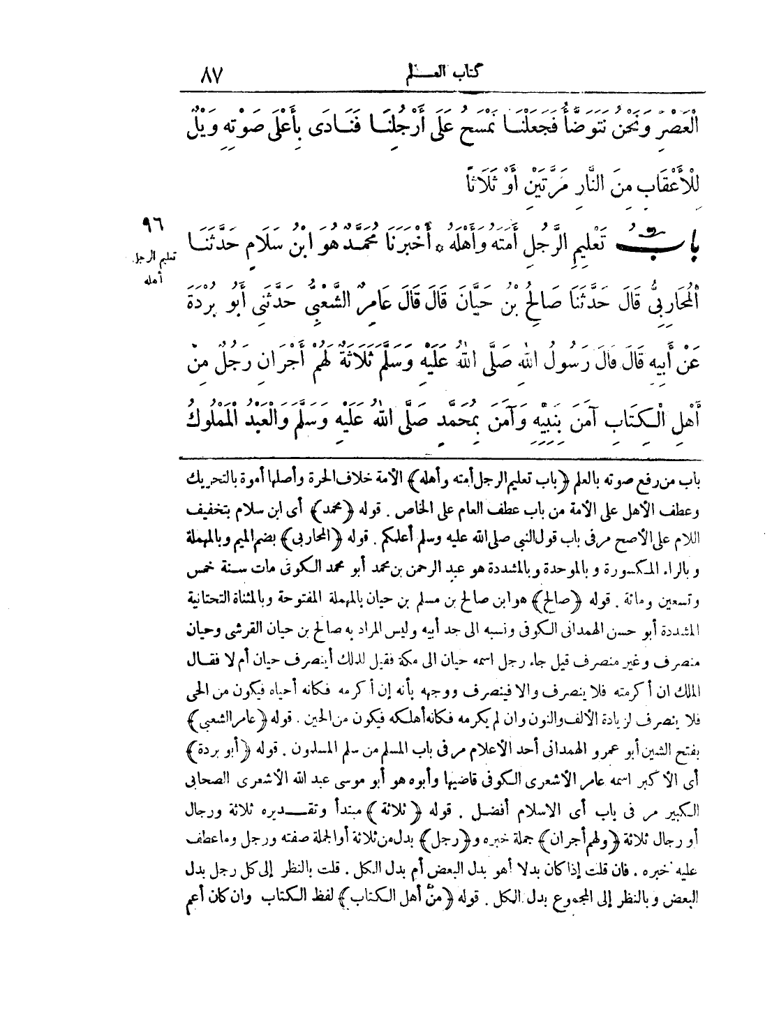 باب من رفع صوته بالعلم (باب تعليم الرجل أمته وأهله) الأمة خلاف الحرة وأصلها أموة بالتحريك وعطف الأهل علي الأمة من باب عطف العام علي الخاص. قوله (محمد) أي ابن سلام بتخفيف اللام علي الأصح مر في باب قول النبي صلي الله عليه وسلم أعلمكم. قوله (المحاربي) بضم الميم وبالمهملة وبالراء المكسورة وبالموحدة وبالمشددة هو عبد الرحمن بن محمد أبو محمد الكوثي مات سنة خمس وتسعين ومائة. قوله (صالح) هو ابن صالح بن مسلم بن حيان بالمهملة المفتوحة وبالمثناة التحتانية المشددة أبو حسن الهمداني الكوفي ونسبه إلي جد أبيه وليس المراد به صالح بن حيان القرشي وحيان منصرف وغير منصرف قيل جاء رجل إسمه حيان إلي مكة فقيل لذلك أيصرف حيان أم لا فقال الملك أن أكرمته فلا ينصرف وإلا فينصرف ووجهه بأنه إن أكرمه فكأنه أحياه فيكون من الحي فلا ينصرف لزيادة الألف والنون وإن لم يكرمه فكأنه أهلكه فيكون من الحين. قوله (عامر الشعبي) بفتح الشين أبو عمرو الهمداني أحد الأعلام مر في باب المسلم من سلم المسلمون. قوله (أبو بردة) أي الأكبر اسمه عامر الأشعري الكوفي قاضيها وأبوه هو أبو موسي عبد الله الأشعري الصحابي الكبير مر في باب أي الإسلام أفضل. قوله (ثلاثة) مبتدأ وتقديره ثلاثة ورجال أو رجال ثلاثة (ولهم أجران) جملة خبره و (رجل) بدل من ثلاثة أو الجملة صفته ورجل وما عطف عليه خبره. فإن قلت إذا كان بدلا أهو بدل البعض أم بدل الكل. قلت بالنظر إلي كل رجل بدل البعض وبالنظر إلي المجموع بدل الكل. قوله (من أهل الكتاب) لفظ الكتاب وإن كان أعم
