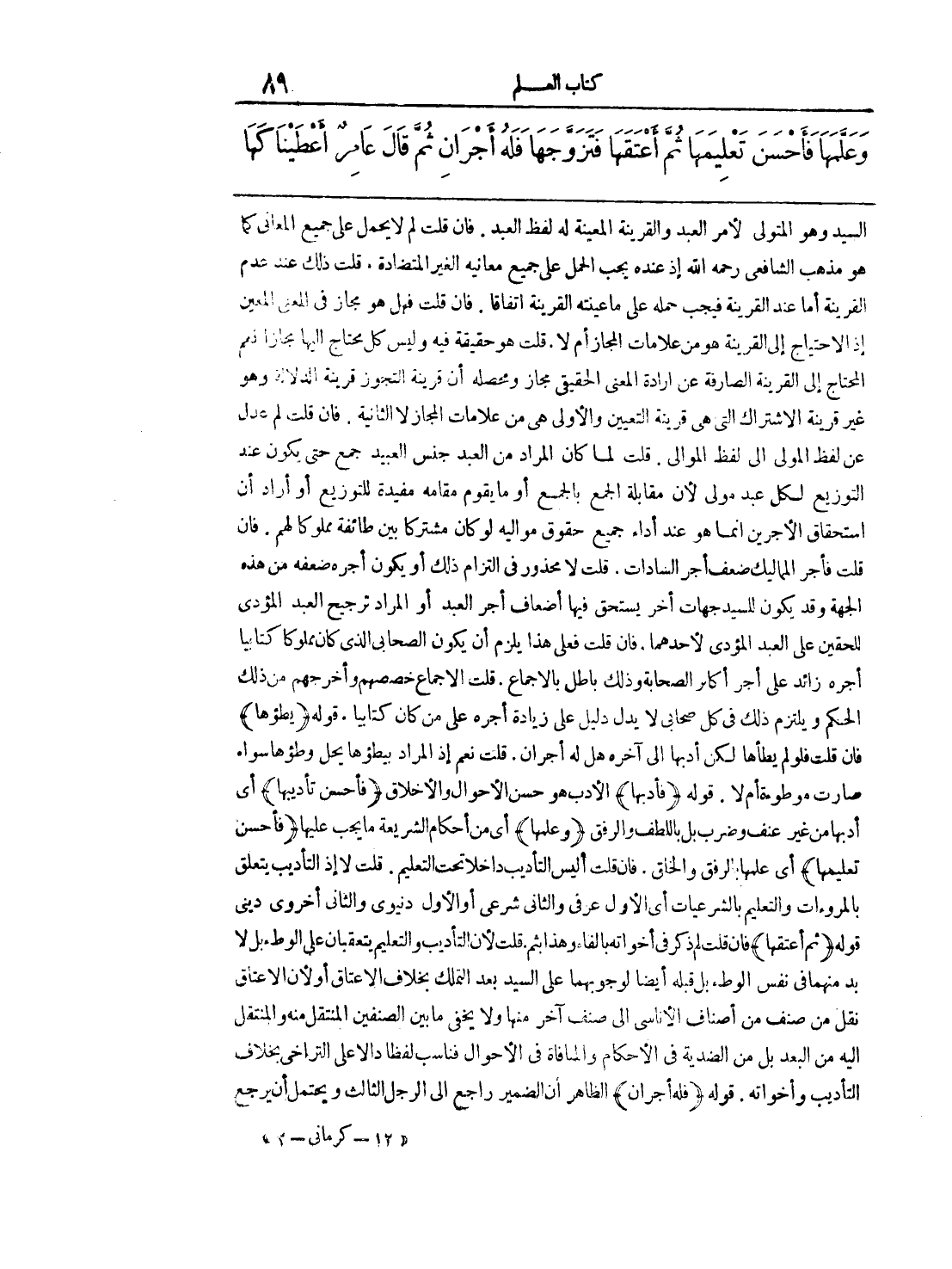 السيد وهو المتولي لأمر العبد والقرينة له لفظ العبد. فإن قلت لم لا يحمل علي جميع المعاني كما هو مذهب الشافعي رحمه الله إذ عنده يجب الحمل علي جميع معانيه الغير المتضادة. قلت ذلك عند عدم القرينة أما عند القرينة فيجب حمله علي ما عينته القرينة اتفاقا. فإن قلت فهل مجاز المعني المعين إذا لاحتياج إلي القرينة هو من علامات المجاز أم لا. قلت هو حقيقة فيه وليس كل محتاج إليها مجازا نعم المحتاج إلي القرينة الصارفة عن إرادة المعني الحقيقي مجاز ومحصله أن قرينة التجوز قرينة الدلالة وهو غير قرينة الإشتراك التي هي قرينة التعيين والأولي هي من علامات المجاز لا الثانية. فإن قلت لم عدل عن لفظ المولي إلي لفظ الموالي. قلت لما كان المراد من العبد من العبد جنس العبيد جمع حتي يكون عند التوزيع لكل عبد مولي لأن مقابلة الجمع بالجمع أو ما يقوم مقامه مفيدة للتوزيع أو أراد أن استحقاق لكل عبد مولي لأن مقابلة الجمع بالجمع أو ما يقوم مقامه للتوزيع أو أراد أن استحقاق الأجرين إنما هو عند أداء جميع حقوق مواليه لو كان مشتركا بين طائفة مملوكا لهم. فإن قلت فأجر المماليك ضعف أجر السادات. قلت لا محذور في التزام ذلك أو يكون أجره ضعفه من هذه الجهة وقد يكون للسيد جهات أخر يستحق فيها أضعاف أجر العبد أو المراد ترجيح العبد المؤدي لأحدهما. فإن قلت فعلي هذا يلزم أن يكون الصحابي الذي كان مملوكا كتابيا أجره زائد علي أجر أكابر الصحابة وذلك باطل بالإجماع. قلت الإجماع خصصهم وأخرجهم من ذلك الحكم ويلتزم ذلك في كل صحابي لا يدل دليل علي زيادة أجره علي من كان كتابيا. قوله (يطؤها) فإن قلت فلو لم يطأها لكن أدبها إلي آخره هل له أجران. قلت نعم إذ المراد يطؤها يحل وطؤها سواء صارت موطوءة أم لا. قوله (فأدبها) الأدب هو حسن الأحوال والأخلاق (فأحسن تأديبها) أي أدبها من غير عنف وضرب بل باللطف والرفق (وعليها) أي من أحكام الشريعة ما يجب عليها (فأحسن تعليمها) أي علمها الرفق والخلق. فإن قلت أليس التأديب داخلا تحت التعليم. قلت لا إذ التأديب يتعلق بالمروءات والتعليم بالشرعيات أي الأول عرفي والثاني شرعي أو الأول دنيوي والثاني أخروي ديني قوله (ثم أعتقها) فإن قلت لم ذكر في أخواته بالفاء وهذا بثم. قلت لأن التأديب والتعليم يتعقبان علي الوطء بل لا بد منهما في نفس الوطء بل قبله أيضا لوجوبهما علي السيد بعد التملك بخلاف الإعتاق نقل من صنف من أصناف الأناسي إلي صنف آخر منها ولا يخفي ما بين الصنفين المنتقل منه والمنتقل إليه من البعد بل من الضدية في الأحكام والمنافاة في الأحوال فناسب لفظا دالا علي التراخي بخلاف التأديب وأخواته. قوله (فله أجران) الظاهر أن الضمير راجع إلي الرجل الثالث ويحتمل أن يرجع