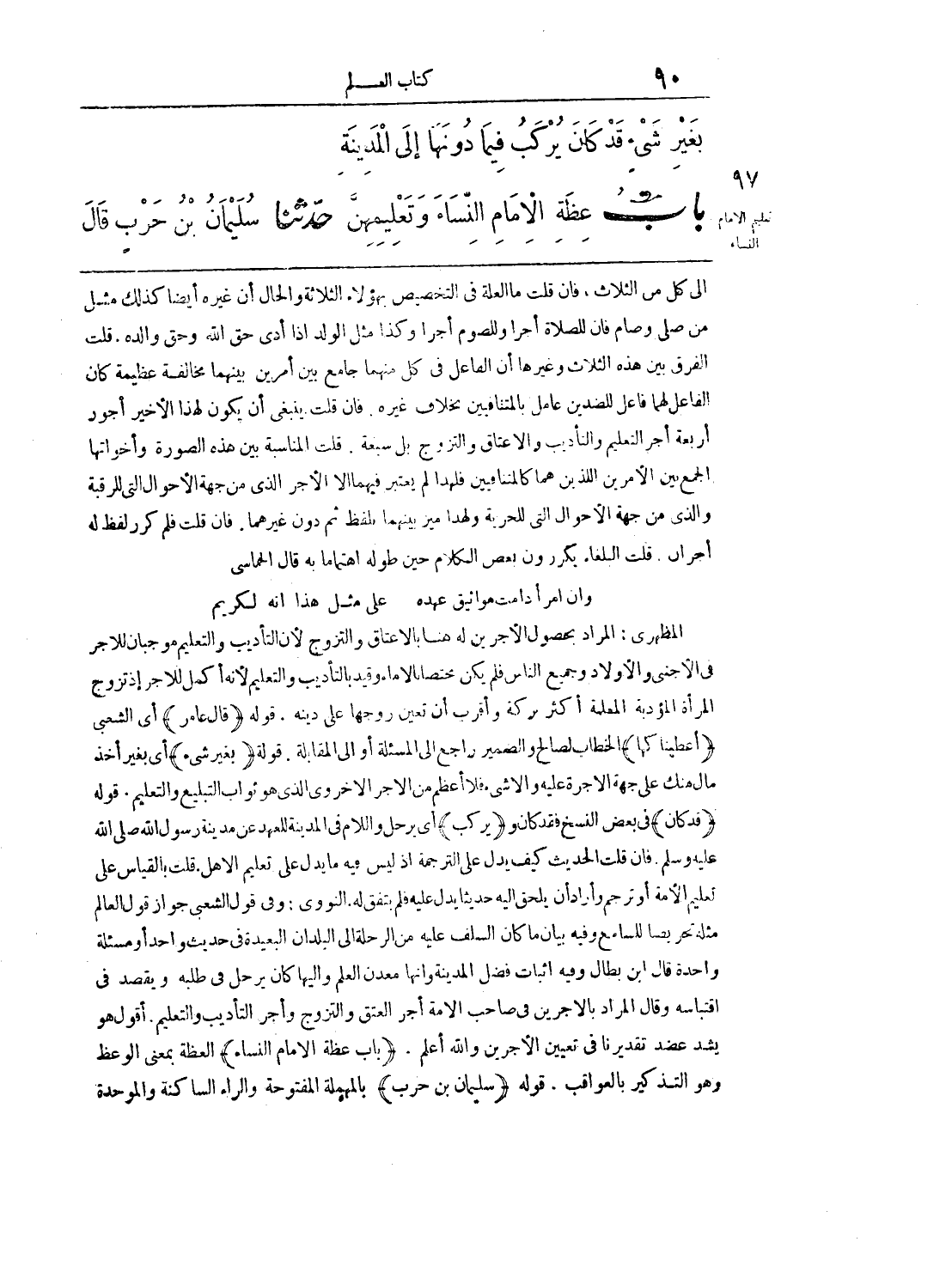 المظهري: المراد بحصول الأجرين له هنا بالإعتاق والتزوج لأن التأديب والتعليم موجبان للأجر في الأجنبي والأولاد وجميع الناس فلم يكن مختصا بالإماء وقيد بالتأديب والتعليم لأنه أكمل للأجر إذ تزوج المرأة المؤدبة المعلمة أكثر بركة وأقرب أن تعين روحها علي دينه. قوله (قال عامر) أي الشعبي (أعطينا كها) الخطاب لصالح والضمير راجع إلي المسألة أو إلي المقابلة. قوله (بغير شيء) أي بغير أخذ مال منك علي جهة الأجرة عليه وإلا شيء فلا أعظم من الأجر الأخروي الذي هو ثواب التبليغ والتعليم. قوله (قد كان) في بعض النسخ فقد كان و (يركب) أي يرحل واللام في المدينة للعهد عن مدينة رسول الله صلي الله عليه وسلم فإن قلت الحديث كيف يدل علي الترجمة إذ ليس ما يدل علي تعليم الأهل، قلت بالقياس علي تعليم الأمة أو ترجم وأراد أن يلحق إليه حديثا يدل عليه فلم يتفق له. النووي: وفي قول الشعبي جواز قول العالم مثله تحريضا للسامع وفيه بيان ما كان السلف عليه من الرحلة إلي البلدان البعيدة في حديث واحد أو مسألة واحدة قال ابن بطال وفيه إثبات فضل المدينة وإنها معدن العلم وإليها كان يرحل في طلبه ويقصد في اقتباسه وقال المراد بالأجرين في صاحب الأمة أجر العتق والتزوج وأجر التأديب والتعليم. أقول هو يشد عضد تقديرنا في تعيين الأجرين والله أعلم. (باب عظة الأمام النساء) العظة بمعني الوعظ وهو التذكير بالعواقب. قوله (سليمان بن حرب) بالمهملة المفتوحة والراء الساكنة والموحدة
