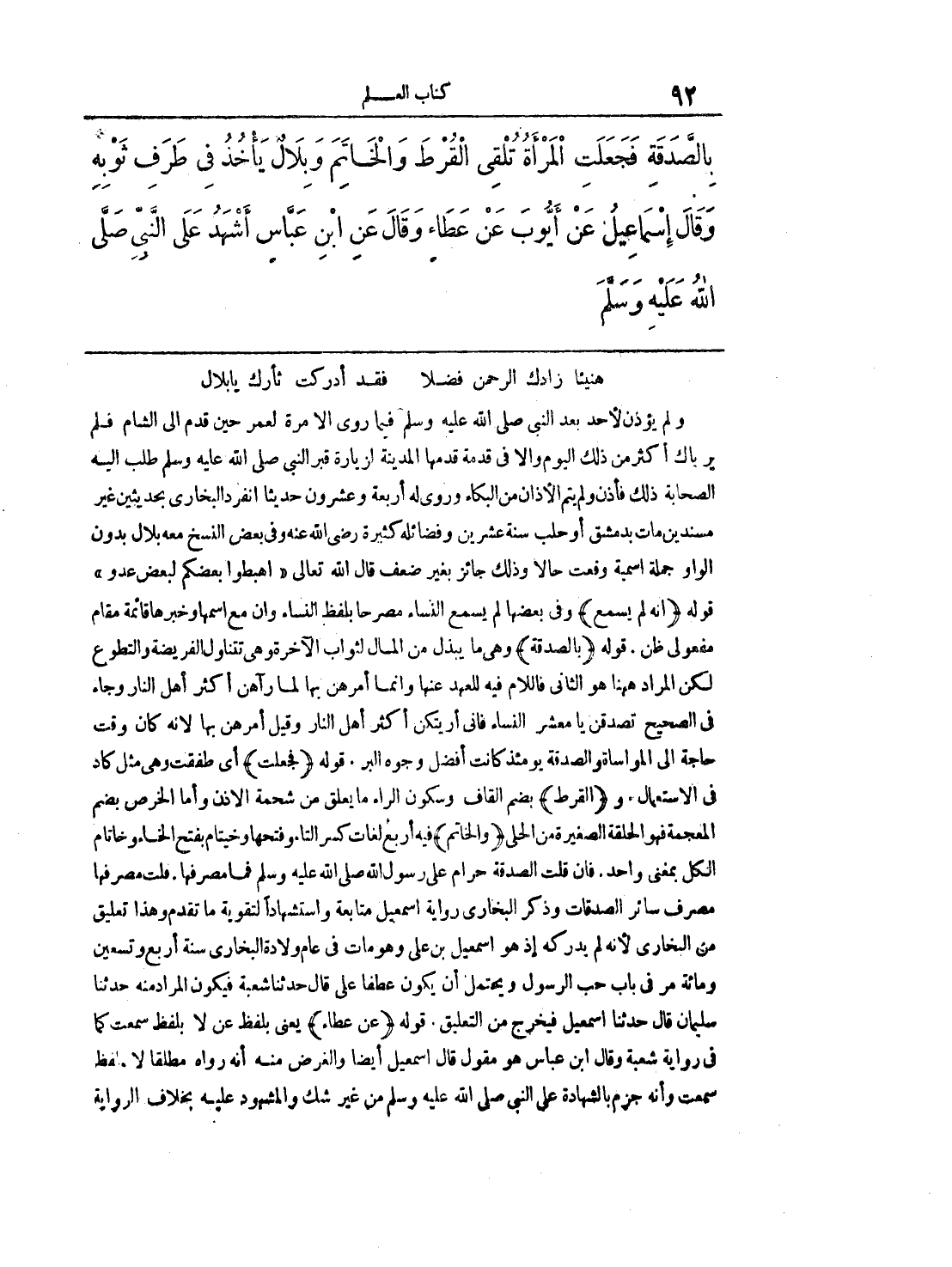 ولم يؤذن لأحد بعد النبي صلي الله عليه وسلم فيما روي إلا مرة لعمر حين قدم إلي الشام فلم يري أكثر من ذلك اليوم وإلا في قدمة قدمها المدينة لزيارة قبر النبي صلي الله عليه وسلم طلب إليه الصحابة ذلك فأذن ولم يتم الأذان من البكاء وروي أربعة وعشرون حديثا انفرد البخاري بحديثين غير مسندين مات بدمشق أو حلب سنة عشرين وفضائله كثيرة رضي الله عنه وفي بعض النسخ معه بلال بدون الواو جملة إسمية وقعت حالا وذلك جائز بغير ضعف قال الله تعالي «اهبطوا بعضكم لبعض عدو» قوله (أنه لم يسمع) وفي بعضها لم يسمع النساء مصرحا بلفظ النساء وإن مع اسمها وخبرها قائمة مقام مفعولي خان. قوله (بالصدقة) وهي ما يبذل من المال لثواب الآخرة وهي تتناول الفريضة والتطوع لكن المراد ههنا هو الثاني فاللام فيه للعهد عنها وإنما أمرهن بها لما رآهن أكثر أهل النار وجاء في الصحيح تصدقن يا معشر النساء فإني أريتكن أكثر أهل النار وقيل أمرهن بها لأنه كان وقت حاجة إلي المواساة والصدقة يومئذ كانت أفضل وجوه البر. قوله (فجعلت) أي طفقت وهي مثل كاد في الإستعمال. و (القرط) بضم القاف وسكون الراء ما يعلق من شحمة الأذن أو الخرص بضم المعجمة فهو الحلقة الصغيرة من الحلي (والخاتم) فيه أربع لغات كسر التاء وفتحها وخيتام بفتح الخاء وخاتام الكل معني واحد. فإن قلت الصدقة حرام علي رسول الله صلي الله عليه وسلم فما مصرفها. قلت مصرفها مصرف سائر الصدقات وذكر البخاري رواية إسمعيل متابعة واستشهادا لتقوية ما تقدم وهذا تعليق عن البخاري لأنه لم يدركه إذ هو إسمعيل بن علي وهو مات في عام ولادة البخاري سنة أربع وتسعين ومائة مر في باب حب الرسول ويحتمل أن يكون عطفا علي قال حدثنا شعبة فيكون المراد منه حدثنا سليمان قال حدثنا اسمعيل فيخرج من التعليق. قوله (عن عطاء) يعني بلفظ عن لا بلفظ سمعت كما في رواية شعبة وقال ابن عباس هو مقول قال اسمعيل أيضا والغرض منه أنه رواه مطلقا لا ملفظ سمعت وأنه جزم بالشهادة علي النبي صلي الله عليه وسلم من غير شك والمشهود عليه بخلاف الرواية