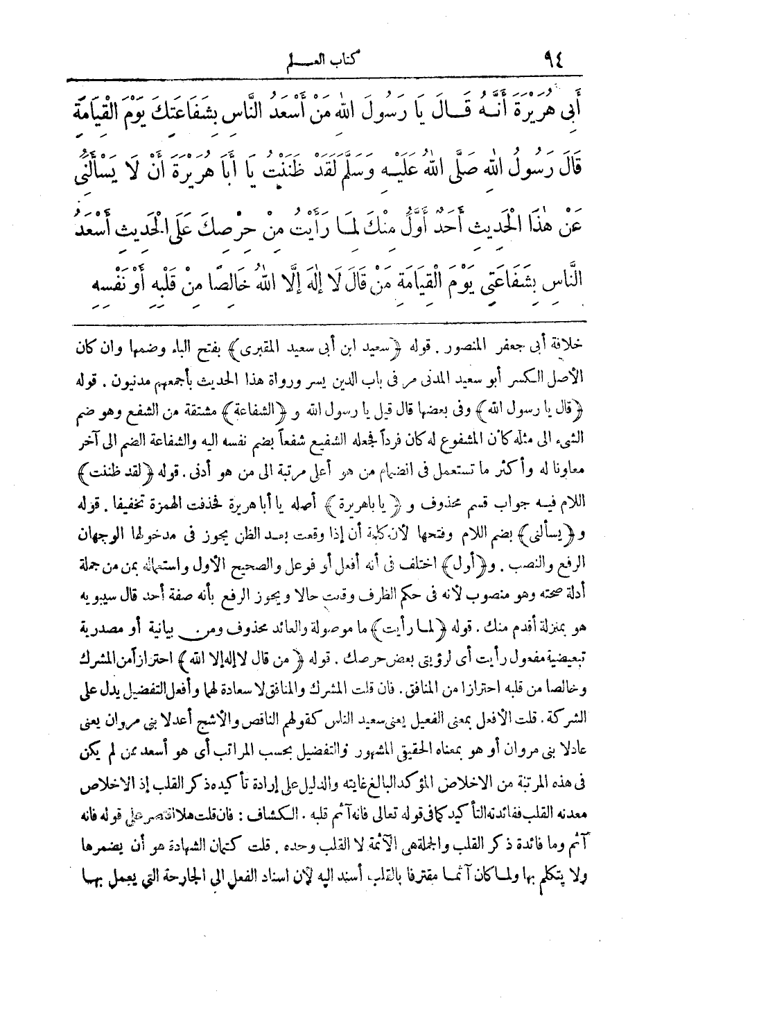 خلافة أبي جعفر المنصور. قوله (سعيد ابن أبي سعيد المقبري) بفتح الباء وضمها وإن كان الأصل الكسر أبو سعيد المدني مر في باب الدين يسر ورواة هذا الحديث بأجمعهم مدنيون. قوله (قال يا رسوا الله) وفي بعضها قال قيل يا رسول الله و (الشفاعة) مشتقة من الشفع وهو ضم الشيء إلي مثله كأن المشفوع له كان فردا فجعله الشفيع شفعا بضم نفسه إليه والشفاعة الضم إلي آخر معاونا له وأكثر ما تستعمل في انضمام من هو أعلي مرتبة إلي من هو أدني. قوله (لقد ظننت) اللام فيه جواب قسم محذوف و (يا باهريرة) أصله يا أبا هريرة فحذفت الهمزة تخفيفا. قوله ز (يسألني) بضم اللام وفتحها لأن كلمة أن إذا وقعت بعد الظن يجوز في مدخولها الوجهان الرفع والنصب. و (أول) اختلف في أنه أفعل أو فوعل والصحيح الأول واستعماله بمن من جملة أدلة صحته وهو منصوب لأنه في حكم الظرف وقعت حالا ويجوز الرفع بأنه صفة أحد قال سيبويه هو بمنزلة أقدم منك. قوله (لما رأت) ما موصولة والعائد محذوف م من بيانية أو مصدرية تبعيضية مفعول رأيت أي لرؤيتي بعض حرصك. قوله (من قال لا إله إلا الله) احترازا من المشرك وخالصا من قلبه احترازا من المنافق. فإن قلت المشرك والمنافق لا سعادة لهما وأفعل التفضيل يدل علي الشركة. قلت الأفعل بمعني الفعيل يعني سعيد الناس كقولهم الناقص والأشج أعدلا بني مروان يعني عادلا بني مروان أو هو بمعناه الحقيقي المشهور في التفضيل بحسب المراتب أي هو أسعد بمن لم يكن في هذه المرتبة من الإخلاص المؤكد البالغ غايته والدليل علي إرادة تأكيده ذكر القلب إذ الإخلاص معدنه القلب ففائدته التأكيد كما في قوله تعالي فإنه آثم قلبه. الكشاف: فأن قلت هلا أقتصر علي قوله فإنه آثم وما فائدة ذكر القلب والجملة هي الآثمة لا القلب وحده. قلت كتمان الشهادة هو أن يضمها ولا يتكلم بها ولما كان آثما مقترفا بالقلب أسند إليه لآن إسناد الفعل إلي الجارحة التي يعمل بها
