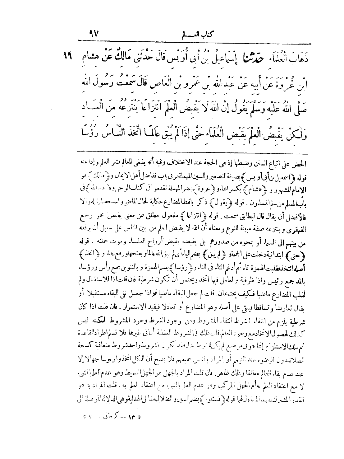 99 - حَدَّثَنَا إِسْمَاعِيلُ بْنُ أَبِى أُوَيْسٍ قَالَ حَدَّثَنِى مَالِكٌ عَنْ هِشَامِ بْنِ عُرْوَةَ عَنْ أَبِيهِ عَنْ عَبْدِ اللَّهِ بْنِ عَمْرِو بْنِ الْعَاصِ قَالَ سَمِعْتُ رَسُولَ اللَّهِ صلى الله عليه وسلم يَقُولُ «إِنَّ اللَّهَ لاَ يَقْبِضُ الْعِلْمَ انْتِزَاعاً، يَنْتَزِعُهُ مِنَ الْعِبَادِ، وَلَكِنْ يَقْبِضُ الْعِلْمَ بِقَبْضِ الْعُلَمَاءِ، حَتَّى إِذَا لَمْ يُبْقِ عَالِماً، اتَّخَذَ النَّاسُ رُءُوساً
