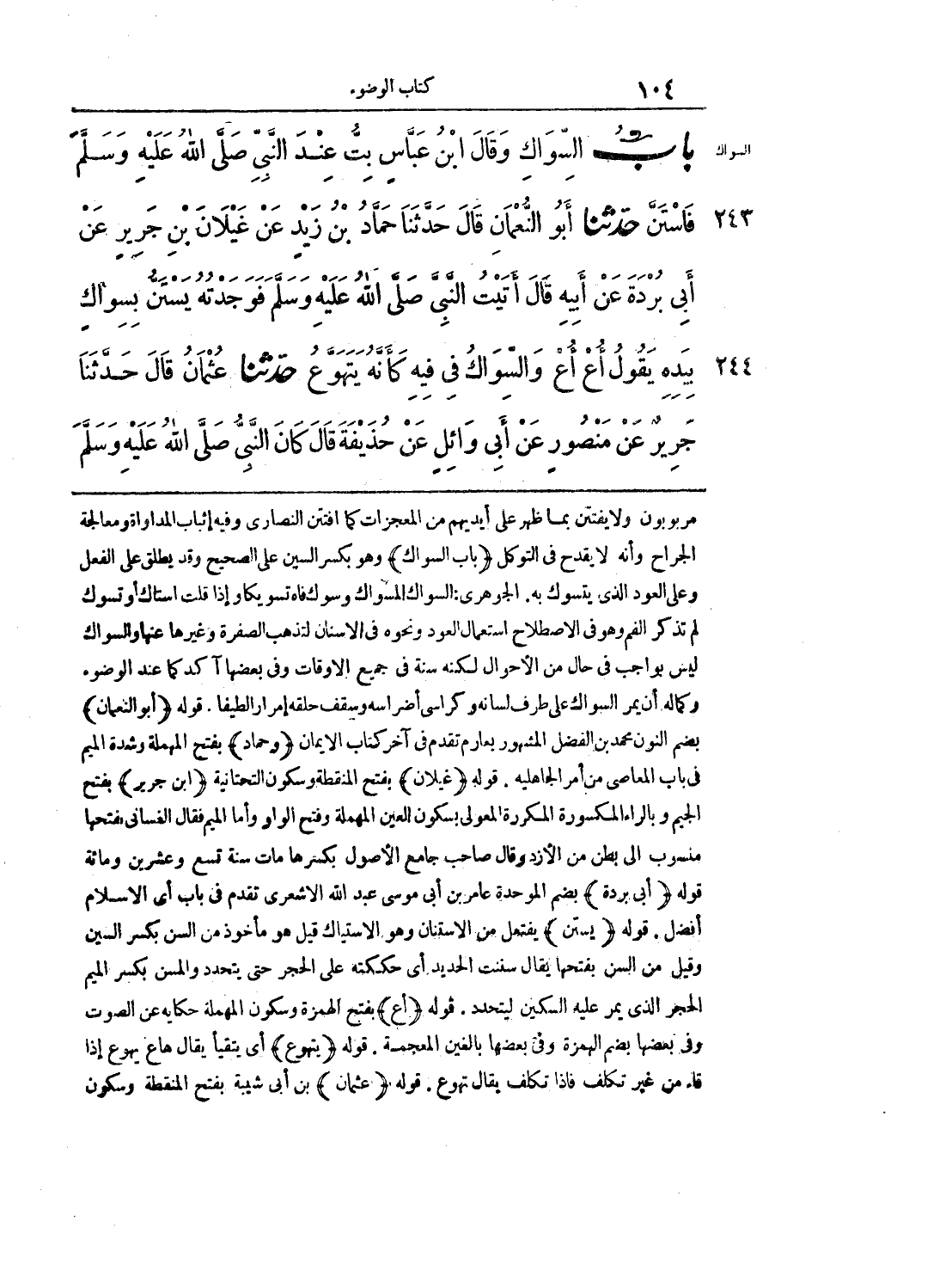 مربوبون ولا يفتنن بما ظهر على أيديهم من المعجزات كما افتتن النصارى وفيه إثباب المداواة ومعالجة الجراح وأنه لا يقدح في التوكل (باب السواك) وهو بكسر السين على الصحيح وقد يطلق على الفعل وعلى العود الذي يتسوك به. الجوهري: السواك المسواك وسوك فاه تسويكاً وإذا قلت استاك أو تسوك لم تذكر الفم وهو في الاصطلاح استعمال العود ونحوه في الأسنان لتذهب الصفرة وغيرها عنها والسواك ليس بواجب في حال من الأحوال لكنه سنة في جميع الأوقات وفي بعضها آكد كما عند الوضوء وكماله أن يمر السواك على طرف لسانه وكراسي أضراسه وسقف حلقه إمراراً لطيفاً. قوله (أبو النعمان) بضم النون محمد بن الفضل المشهور بعارم تقدم في آخر كتاب الإيمان (وحماد) بفتح المهملة وشدة الميم في باب المعاصي من أمر الجاهلية. قوله (غيلان) بفتح المنقطة وسكون التحتانية (ابن جرير) بفتح الجيم وبالراء المكسورة المعولي بسكون للعين المهملة وفتح الواو وأما الميم فقال الغساني فتحها منسوب إلى بطن من الأزد وقال صاحب جامع الأصول بكسرها مات سنة تسع وعشرين ومائة قوله (أبي بريدة) بضم الموحدة عامر بن أبي موسى عبد الله الأشعري تقدم في باب أي الإسلام أفضل. قوله (يستن) يفتعل من الاستنان وهو الاستياك قيل هو مأخوذ من السن بكسر السين وقيل من السن بفتحها يقال سننت الحديد أي حككته على الحجر حتى يتحدد والمسن بكسر الميم الحجر الذي يمر عليه السكين ليتحدد. قوله (أع) بفتح الهمزة وسكون المهملة حكاية عن الصوت وفي بعضها بضم الهمزة وفي بعضها بالغين المعجمة. قوله (يتهوع) أي يتقيأ يقال هاع يهوع إذا قاء من غير تكلف فإذا تكلف يقال تهوع. قوله (عثمان) بن أبي شيبة بفتح المنقطة وسكون
