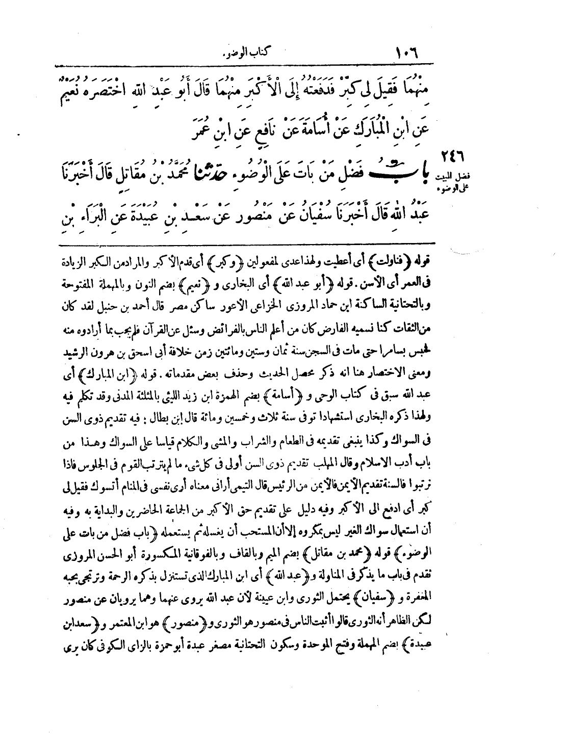 قوله (فناولت) أي أعطيت ولهذا عدى لمفعولين (وكبر) أي قدم الأكبر والمراد من الكبر الزيادة في العمر أي الأسن. قوله (أبو عبد الله) أي البخاري و (نعيم) بضم النون وبالمهملة المفتوحة وبالتحتانية الساكنة ابن حماد المروزي الخزاع يالأعور ساكن مصر قال أحمد بن حنبل لقد كان من الثقات كنا نسميه الفارض كان من أعلم الناس بالفرائض وسئل عن القرآن فلم يجب بما أرادوه منه فحبس بسامرا حتى مات في السجن سنة ثمان وستين ومائتين زمن خلافة أبي إسحق بن هرون الرشيد ومعنى الاختصار هنا أنه ذكر نحصل الحديث وحذف بعض مقدماته. قوله (ابن المبارك) أي عبد الله سبق في كتاب الوحي و (أسامة) بضم الهمزة ابن زيد الليثي بالمثلثة المدني وقد تكلم فيه ولهذا ذكره البخاري استشهاداً توفي سنة ثلاث وخمسين ومائة قال ابن بطال: فيه تقديم ذوي السن في السواك وكذا ينبغي تقديمه في الطعام والشراب والمشي والكلام قياساً على السواك وهذا من باب أدب الإسلام وقال المهلب تقديم ذوي السن أولى في كل شئ ما لم يترتب القوم في الجلوس فإذا ترتبوا فالسنة تقديم الأيمن فالأيمن من الرئيس قال التيمي أراني معناه أرى نفسي في المنام أتسوك فقيل لي كبر أي ادفع إلى الأكبر وفيه دليل على تقديم حق الأكبر من الجماعة الحاضرين والبداية به وفيه أن استعمال سواك الغير ليس بمكروه إلا أن المستحب أن يغسله ثم يستعمله (باب فضل من بات على الوضوء) قوله (محمد بن مقاتل) بضم الميم وبالقاف وبالفوقانية المكسورة أبو الحسن المروزي تقدم في باب ما يذكر في المناولة و (عبد الله) أي ابن المبارك الذي تستنزل بذكره الرحمة وترتجى بحبه المنفرة و (سفيان) يحتمل الثوري وابن عيينة لأن عبد الله يروي عنهما وهما يرويان عن منصور لكن الظاهر أنه الثوري قالوا أثبت الناس في منصور هو الثوري و (منصور) هو ابن المعتمر و (سعد ابن عبيدة) بضم المهملة وفتح الموحدة وسكون التحتانية مصغر عبدة أبو حمزة بالزاي الكوفي كان يرى