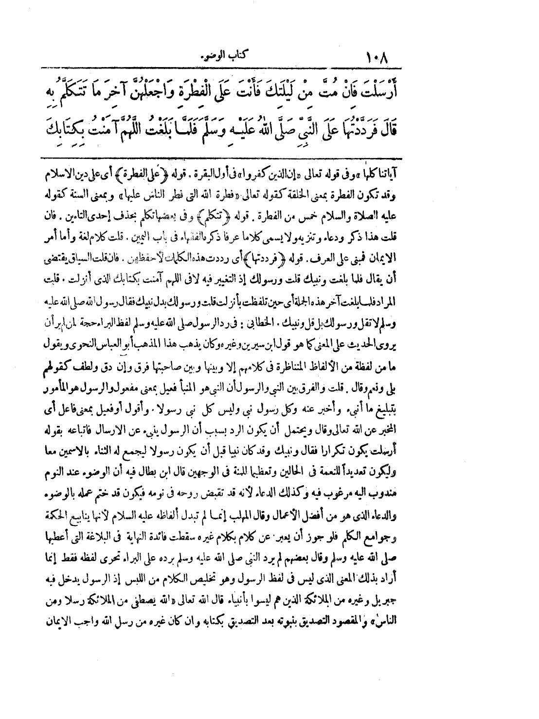 آياتنا كلها) وفي قوله تعالى (إن الذين كفروا) في أول البقرة. قوله (على الفطرة) أي على دين الإسلام وقد تكون الفطرة بمعنى الخلقة كقوله تعالى (فطرة الله التي فطر الناس عليها) وبمعنى السنة كقوله عليه الصلاة والسلام خمس من الفطرة. قوله (تتكلم) وفي بعضها تكلم بحذف إحدى التاءين. فإن قلت هذا ذكر ودعاء وتنزيه ولا يسمى كلاماً عرفاً ذكر بالفقهاء في باب اليمين. قلت كلام لغة وأما أمر الإيمان فمبني على العرف. قوله (فرددتها) أمي رددت هذه الكلمات لأحفظهن. فإن قلت السياق يقتضي أن يقال فلما بلغت ونبيك قلت ورسولك إذ التغيير فيه لا في اللهم آمنت بكتابك الذي أنزلت. قلت المراد فلما بلغت آخر هذه الجملة هذه الجملة أي حين تلفظت بأنزلت قلت ورسولك بدل نبيك فقال رسول الله صَلَّى الله عليه وسلّم لا تقل ورسولك بل قل ونبيك. الخطابي: في رد الرسول صَلَّى الله عليه وسلّم لفظ البراء حجة لمن لم ير أن يروى الحديث على المعنى كما هو قول ابن سيرين وغيره وكان يذهب هذا المذهب أبو العباس النحوي ويقول ما من لفظة من الألفاظ المتناظرة في كلامهم إلا وبينها وبين صاحبتها فرق وإن دق ولطف كقولهم بلى ونعم وقال. قلت والفرق بين النبي والرسول أن النبي هو المنبأ فعيل بمعنى مفعول الرسول هو المأمور بتبليغ ما أنبئ وأخبر عنه وكل رسول نبي وليس كل نبي رسولاً. وأقول أو فعيل بمعنى فاعل أي المخبر عن الله تعالى. وقال ويحتمل أن يكون الرد بسبب أن الرسول ينبئ عن الإرسال فاتباعه بقوله أرسلت يكون تكراراً فقال ونبيك وقد كان نبياً قبل أن يكون رسولاً ليجمع له الثناء بالاسمين معاً وليكون تعديداً للنعمة في الحالين وتعظيماً للمنة في الوجهين قال ابن بطال فيه أن الوضوء عند النوم مندوب إليه مرغوب فيه وكذلك الدعاء لأنه قد تقبض روحه في نومه فيكون قد ختم عمله بالوضوء والدعاء الذي هو من أفضل الأعمال وقال المهلب إنما لم تبدل ألفاظه عليه السلام لأنها ينابيع الحكمة وجوامع الكلم فلو جوز أن يعبر عن كلام بكلام غيره سقطت فائدة النهاية في البلاغة التي أعطها صَلَّى الله عليه وسلّم وقال بعضهم لم يرد النبي صَلَّى الله عليه وسلّم برده على البراء تحرى لفظه فقط إنما أراد بذلك المعنى الذي ليس في لفظ الرسول وهو تخليص الكلام من اللبس إذ الرسول يدخل فيه جبريل وغيره من الملائكة الذين هم ليسوا بأنبياء قال الله تعالى (الله يصطفي من الملائكة رسلاً ومن الناس) والمقصود التصديق بنبوته بعد التصديق بكتابه وإن كان غيره من رسل الله واجب الإيمان