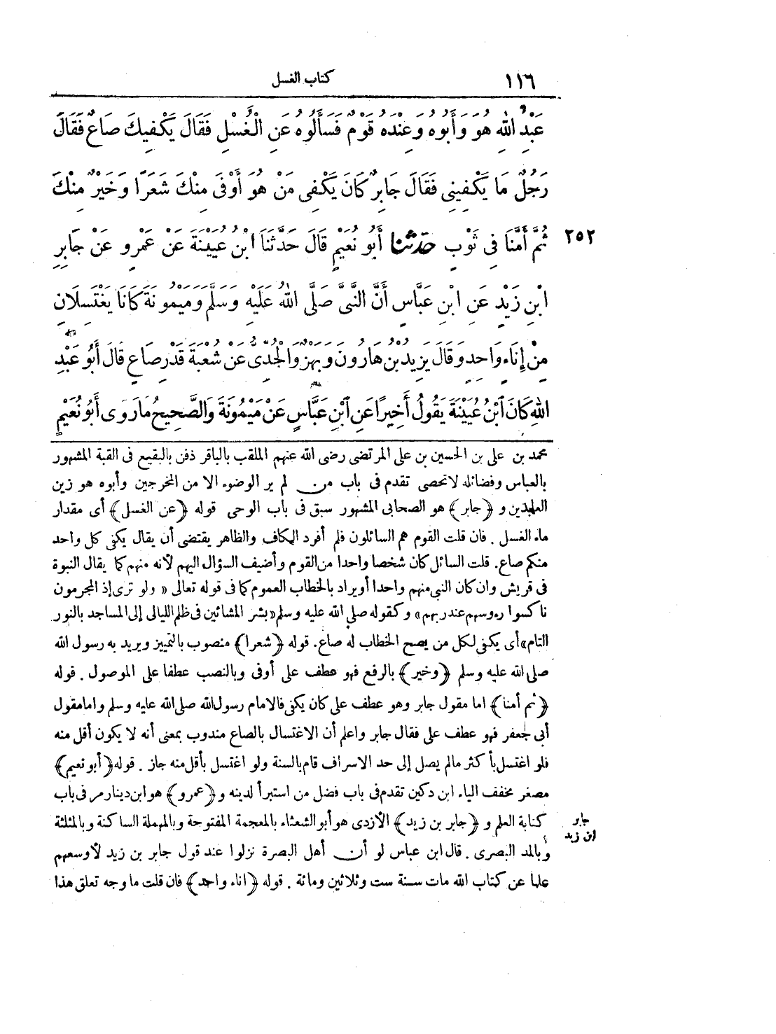 عَبْدِ اللَّهِ هُوَ وَأَبُوهُ، وَعِنْدَهُ قَوْمٌ فَسَأَلُوهُ عَنِ الْغُسْلِ. فَقَالَ يَكْفِيكَ صَاعٌ. فَقَالَ رَجُلٌ مَا يَكْفِينِى. فَقَالَ جَابِرٌ كَانَ يَكْفِى مَنْ هُوَ أَوْفَى مِنْكَ شَعَراً، وَخَيْرٌ مِنْكَ، ثُمَّ أَمَّنَا فِى ثَوْبٍ.