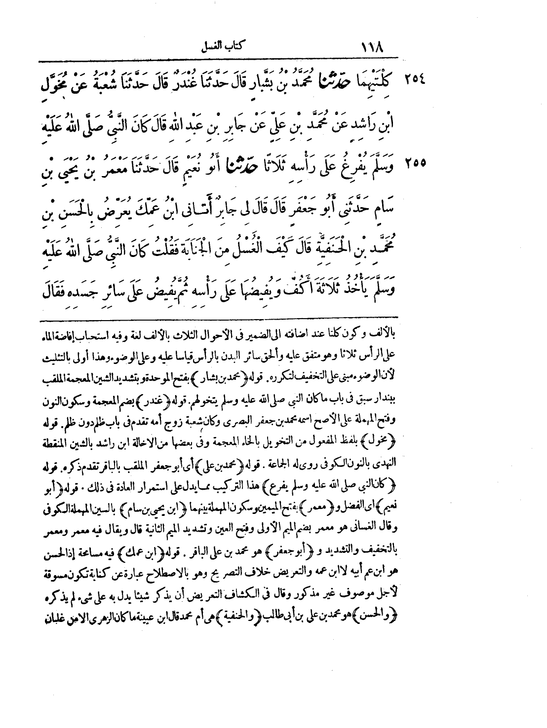 254 - حَدَّثَنَا مُحَمَّدُ بْنُ بَشَّارٍ قَالَ حَدَّثَنَا غُنْدَرٌ قَالَ حَدَّثَنَا شُعْبَةُ عَنْ مِخْوَلِ بْنِ رَاشِدٍ عَنْ مُحَمَّدِ بْنِ عَلِىٍّ عَنْ جَابِرِ بْنِ عَبْدِ اللَّهِ قَالَ كَانَ النَّبِىُّ صَلَّى الله عليه وسلّم يُفْرِغُ عَلَى رَاسِهِ ثَلاَثاً