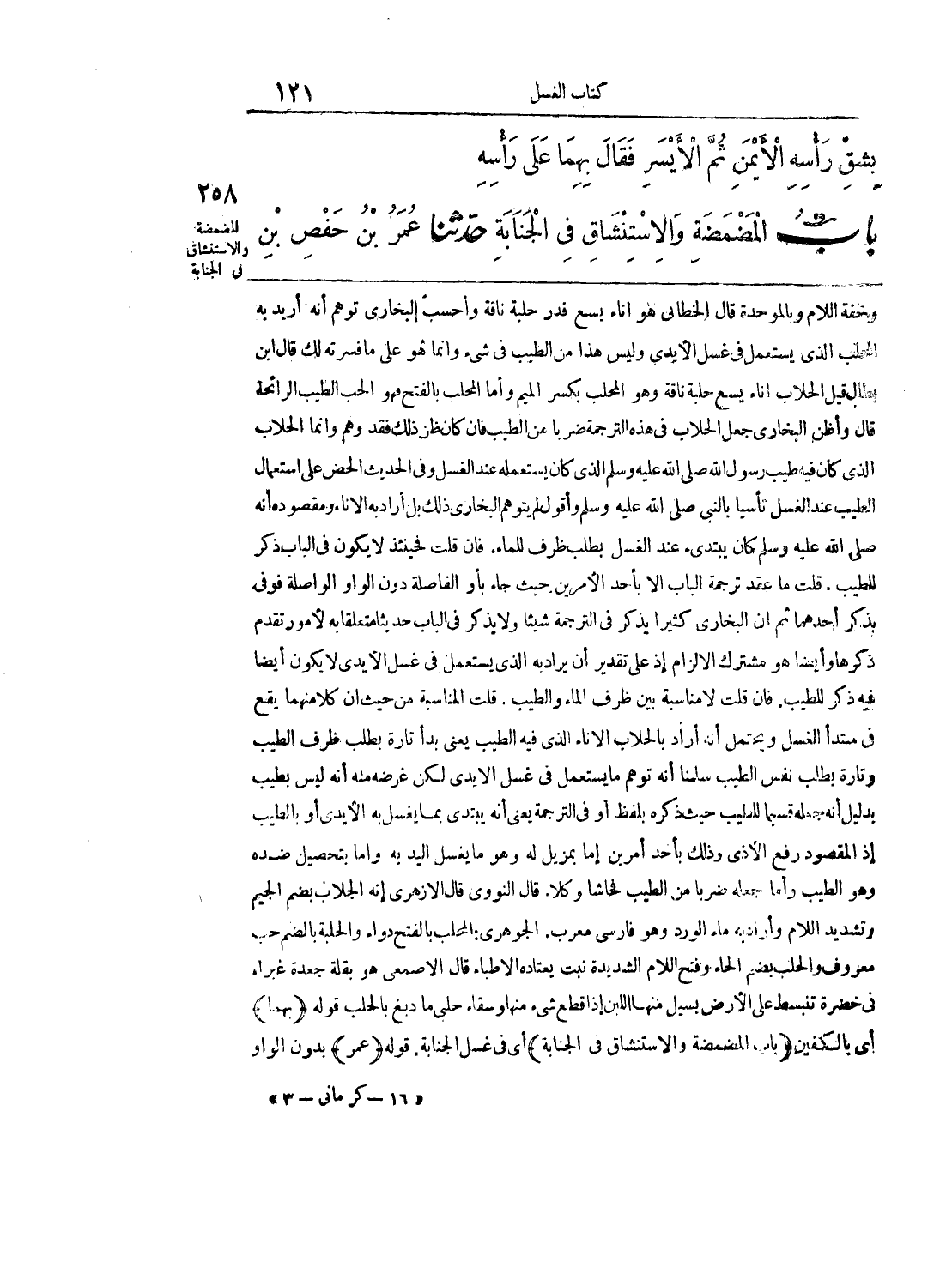 وخفة اللام وبالموحدة قال الخطابي هو إناء يسع قدر حلبة ناقة وأحسب البخاري توهم أنه أريد به المحلب الذي يستعمل في غسل الأيدي وليس هذا من الطيب في شئ وإنما هو على ما فسرته لك قال ابن بطال قيل الحلاب إناء يسع حلبة ناقة وهو المحلب بكسر الميم وأما المحلب بالفتح فهو الحب الطيب الرائحة قال وأظن البخاري جعل الحلاب في هذه الترجمة ضرباً عن الطيب فإن كان ظن ذلك فقد وهم وإنما الحلاب الذي كان فيه طيب رسول الله صَلَّى الله عليه وسلّم الذي كان يستعمله عند الغسل وفي الحديث الحض على استعمال الطيب عند الغسل تأسياً بالنبي صَلَّى الله عليه وسلّم وأقول لم يتوهم البخاري ذلك بل أراد به الإناء ومقصوده أنه صَلَّى الله عليه وسلّم كان يبتدئ عند الغسل بطلب ظرف للماء. فإن قلت فحينئذٍ لا يكون في الباب ذكر للطيب. قلت ما عقد ترجمة الباب إلا بأحد الأمرين حيث جاء بأو الفاصلة دون الواو الواصلة فوفى بذكر أحدهما ثم أن البخاري كثيراً يذكر في الترجمة شيئاً ولا يذكر في الباب حديثاً متعلقاً به لأمور تقدم ذكرها وأيضاً هو مشترك الإلزام إذ على تقدير أن يراد به الذي يستعمل في غسل الأيدي لا يكون أيضاً فيه ذكر للطيب. فإن قلت لا مناسبة بين ظرف الماء والطيب. قلت المناسبة من حيث أن كلاً منهما يقع في مبتدأ الغسل ويحتمل أنه أراد بالحلاب الإناء الذي فيه الطيب يعني بدأ تارة بطلب ظرف الطيب وتارةً بطلب نفس الطيب سلمنا أنه توهم ما يستعمل في غسل الأيدي لكن غرضه منه أنه ليس بطيب بدليل أنه جعله قسيماً للطيب حيث ذكره بلفظ أو في الترجمة يعني أنه يبتدي بما يغسل به الأيدي أو بالطيب إذ المقصود رفع الأذى وذلك بأحد أمرين إما بمزيل له وهو ما يغسل اليد به وإما بتحصيل ضده وهو الطيب وأما جعله ضرباً من الطيب فحاشا وكلا. قال النووي قال الأزهري إنه الجلاب بضم الجيم وتشديد اللام وأراد به ماء الورد وهو فارسي معرب. الجوهري بالحلب بالفتح دواء والحلبة بالضم ...... معروف والحلب بضم الحاء وفتح اللام الشديدة نبت يعتاده الأطباء قال الأصمعي هو بقلة جعدة غبراء في خضرة تنبسط على الأرض يسيل منها اللبن إذا قطع شئ منها وسقاء حلبي ما دبغ بالحلب قوله (بهما) أي بالكفين (باب المضمضة والاستنشاق في الجنابة) أي في غسل الجنابة. قوله (عمر) بدون الواو