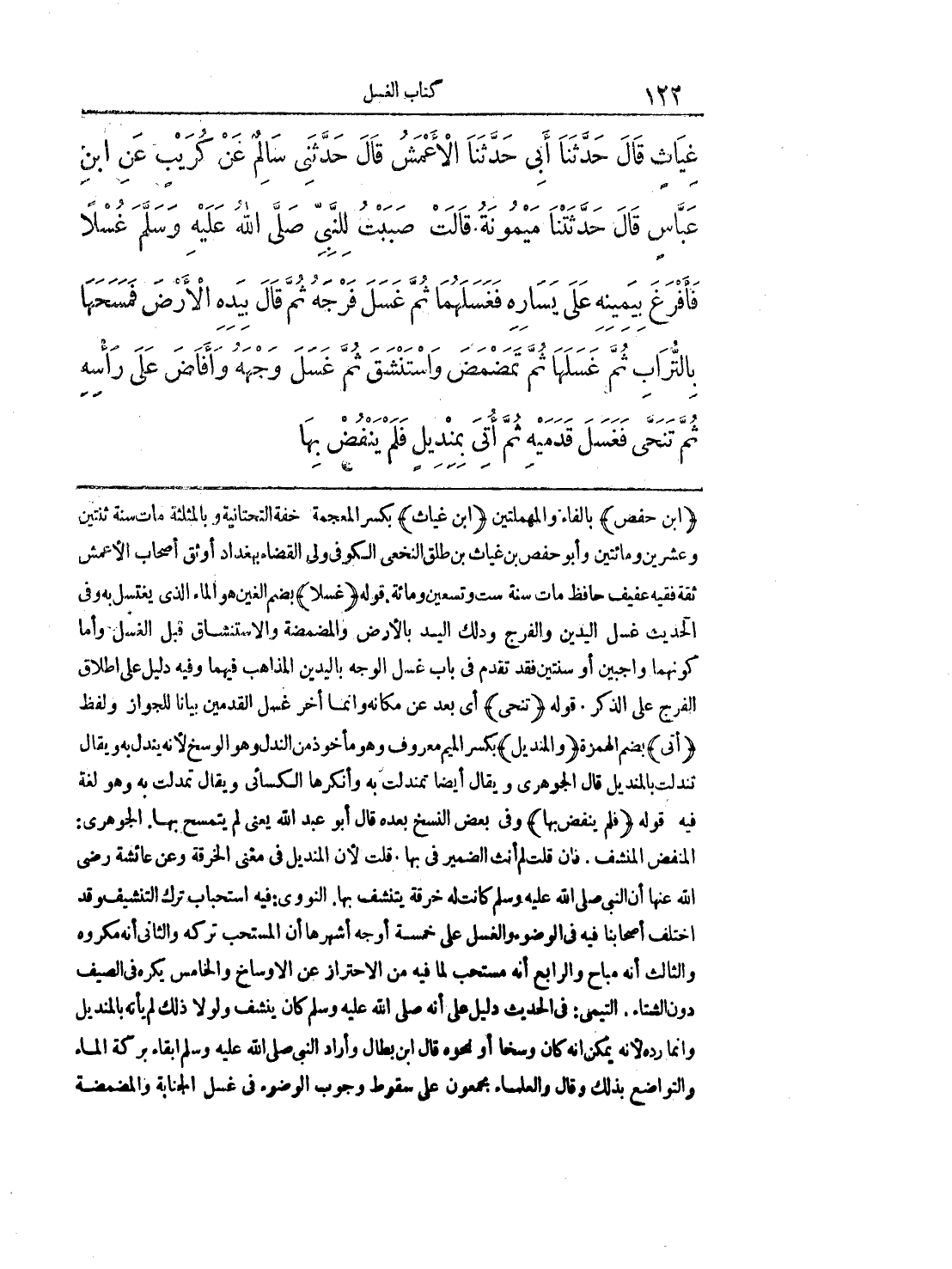 (ابن حفص) بالفاء والمهملتين (ابن غياث) بكسر المعجمة خفة التحتانية وبالمثلثة مات سنة ثنتين وعشرين ومائتين وأبو حفص بن غياث بن طلق النخعي الكوفي ولي القضاء ببغداد أوثق أصحاب الأعمش ثقة فقيه عفيف حافظ مات سنة ست وتسعين ومائة. قوله (غسلا) بضم الغين هو الماء الذي يغتسل به وفي الحديث غسل اليدين والفرج ودلك اليدين بالأرض والمضمضة والاستنشاق قبل الغسل وأما كونهما واجبين أو سنتين فقد تقدم في باب غسل الوجه باليدين المذاهب فيهما وفيه دليل على إطلاق الفرج على الذكر. قوله (تنحى) أي بَعُد عن مكانه وإنما أخر غسل القدمين بياناً للجواز ولفظ (أتى) بضم الهمزة (والمنديل) بكسر الميم معروف وهو مأخوذ من الندل وهو الوسخ لأنه يندل به ويقال قندلت بالمنديل قال الجوهري ويقال أيضاً تمندلت به وأنكرها الكسائي ويقال تمدلت به وهو لغة فيه قوله (فلم ينفض بها) وفي بعض النسخ بعده قال أبو عبد الله يعني لم يتمسح بها. الجوهري: المنفض المنشف. فإن قلت لم أنث الضمير في بها. قلت لأن المنديل في مغنى الخرقة وعن عائشة رضي الله عنها أن النبي صَلَّى الله عليه وسلّم كانت له خرقة يتنشف بها. النووي: فيه استحباب ترك التنشيف وقد اختلف أصحابنا فيه في الوضوء والغسل على خمسة أوجه أشهرها أن المستحب تركه والثاني أنه مكروه والثالث أنه مباح والرابع أنه مستحب لما فيه من الاحتراز عن الأوساخ والخامس يكره في الصيف دون الشتاء. التيمي: في الحديث دليل على أنه صَلَّى الله عليه وسلّم كان ينشف ولولا ذلك لم يأته بالمنديل وإنما رده لأنه يمكن أنه كان وسخاً أو نحوه قال ابن بطال وأراد النبي صَلَّى الله عليه وسلّم إبقاء بركة الماء والتواضع بذلك وقال والعلماء مجمعون على سقوط وجوب الوضوء في غسل الجنابة والمضمضة