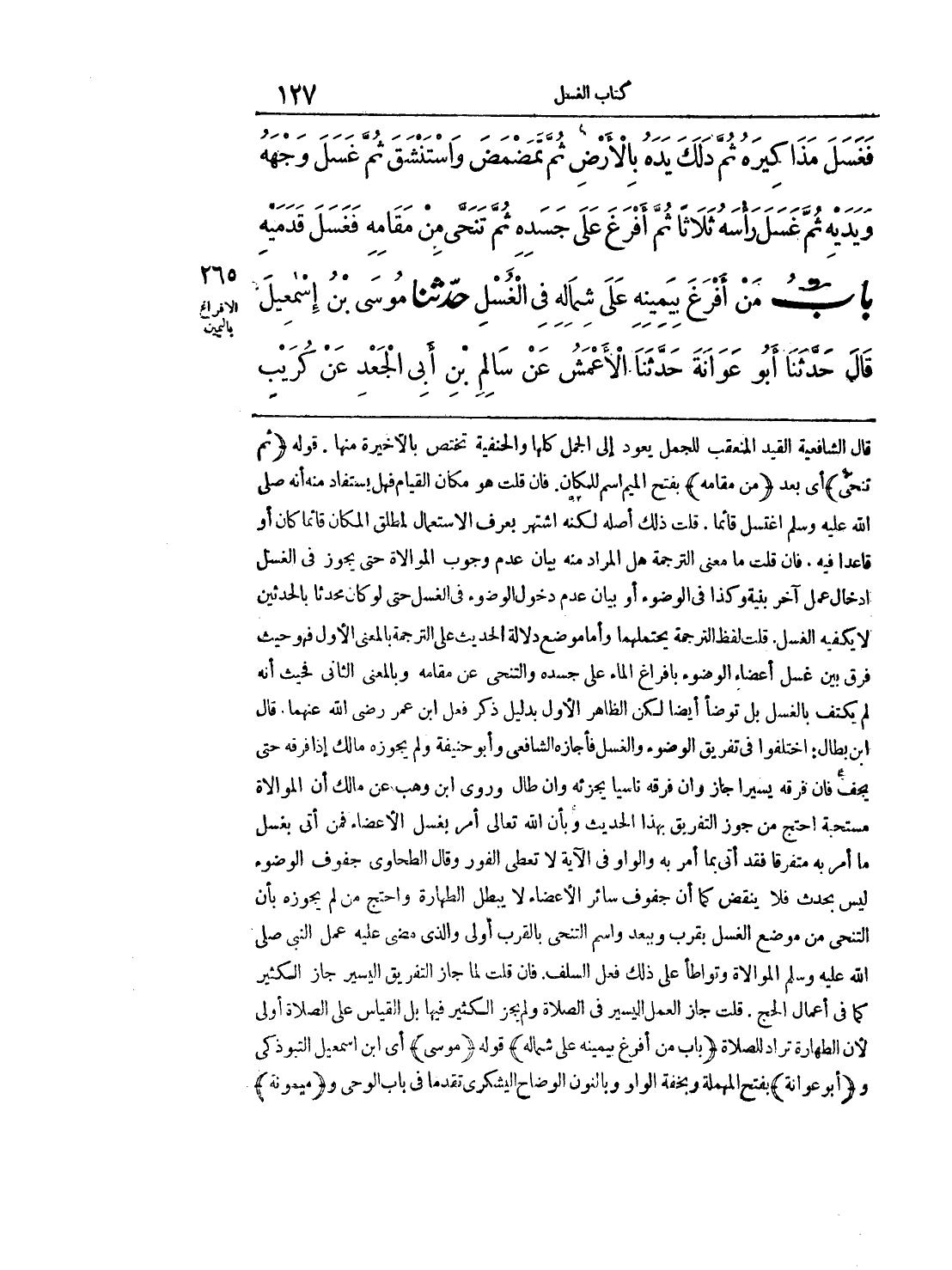 قال الشافعية القيد المنعقب للجمل يعود إلى الجمل كلها والحنفية تختص بالأخيرة منها. قوله (ثم تنحى) أي بعد (من مقامه) بفتح الميم اسم للمكان. فإن قلت هو مكان القيام فهل يستفاد منه أنه صَلَّى الله عليه وسلّم اغتسل قائماً. قلت ذلك أصله لكنه اشتهر بعرف الاستعمال لمطلق المكان قائماً كان أو قاعداً فيه. فإن قلت ما معنى الترجمة هل المراد منه بيان عدم وجوب الموالاة حتى يجوز في الغسل إدخال عمل آخر بنية وكذا في الوضوء أو بيان عدم دخول الوضوء في الغسل حتى لو كان محدثاً بالحدثين لا يكفيه الغسل. قلت لفظ الترجمة يحتملهما وأما موضع دلالة الحديث على الترجمة بالمعنى الأول فهو حيث فرق بين غسل أعضاء الوضوء أو بيان عدم دخول الوضوء في الغسل حتى لو كان محدثاً بالحدثين لا يكفيه الغسل. قلت لفظ الترجمة يحتملهما وأما موضع دلالة الحديث على الترجمة بالمعنى الأول فهو حيث فرق بين غسل أعضاء الوضوء بإفراغ الماء على جسده والتنحي عن مقامه وبالمعنى الثاني فحيث أنه لم يكتف بالغسل بل توضأ أيضاً لكن الظاهر الأول بدليل ذكر فعل ابن عمر رضي الله عنهما. قال ابن بطال: اختلفوا في تفريق الوضوء والغسل فأجازه الشافعي وأبو حنيفة ولم يجوزه مالك إذا فرقه حتى يجف فإن فرقه يسيراً جاز وإن فرقه ناسياً يجزئه وإن طال وروى ابن وهب عن مالك أن الموالاة مستحبة احتج من جوز التفريق بهذا الحديث وبأن الله تعالى أمر بغسل الأعضاء فمن أتى بغسل ما أمر به متفرقاً فقد أتى بما أمر به والواو في الآية لا تعطي الفور وقال الطحاوي جفوف الوضوء ليس بحدث فلا ينقض كما أن جفوف سائر الأعضاء لا يبطل الطهارة واحتج من لم يجوزه بأن التنحي من موضع الغسل بقرب وببعد واسم التنحي بالقرب أولى والذي مضى عليه عمل النبي صَلَّى الله عليه وسلّم الموالاة وتواطأ على ذلك فعل السلف. فإن قلت لما جاز التفريق اليسير جاز الكثير كما في أعمال الحج. قلت جاز العمل اليسير في الصلاة ولم يجز الكثير فيها بل القياس على الصلاة أولى لأن الطهارة تراد للصلاة. (باب من أفرغ بيمينه على شماله) قوله (موسى) أي ابن إسمعيل التبوذكي و (أبو عوانة) بفتح المهملة وبخفة الواو وبالنون الوضاح اليشكري تقدما في باب الوحي و (ميمونة)