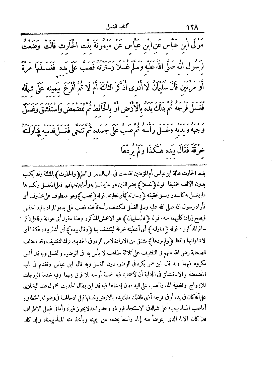 بنت الحارث خالة ابن عباس أم المؤمنين تقدمت في باب السمر في العلم (والحارث) بالمثلثة وقد يكتب بدون الألف تخفيفاً. قوله (غسلا) بضم الغين هو ما يغتسل به وأما بفتحها فهو فعل المغتسل وبكسرها ما يغسل به كالسدر وسبق تحقيقه (وسترته) أي غطيته. قوله (فصب) وهو معطوف على محذوف أي فأراد رسول الله صَلَّى الله عليه وسلّم الغسل فكشف رأسه فأخذه نصب على يده والمراد باليد الجنس فيصح إرادة كلتيهما منه. قوله (قال سليمان) هو الأعمش المذكور وهذا مقول أبي عوانة وفاعل ذكر سالم المذكور. قوله (فناولته) أي أعطيته خرقة ليتنشف بها (وقال بيده) أي أشار بيده هكذا أي لا تناولنيها ولفظ (ولم يردها) مشتق من الإرادة لا من الرد وفي الحديث ترك التنشيف وقد اختلف الصحابة رضي الله عنهم في التنشيف على ثلاثة مذاهب لا بأس به في الوضوء والغسل وبه قال أنس مكروه فيهما وبه قال ابن عمر يكره في الوضوء دون الغسل وبه قال ابن عباس وتقدم في باب المضمضة والاستنشاق في الجنابة أن لأصحابنا فيه قال ابن بطال الحديث محمول عند البخاري على أنه كان في يده أو في فرجه أذى فلذلك دلك يده بالأرض وغسلها قبل إدخالها في وضوئه. الخطابي: أما صب الماء بيمينه على شماله في الاستنجاء فهو ذو وجه واحد لا يجوز غيره وأما في غسل الأطراف فإن كان الإناء الذي يتوضأ منه إناء واسعاً يضعه عن يمينه ويأخذ منه الماء بيمناه وإن كان