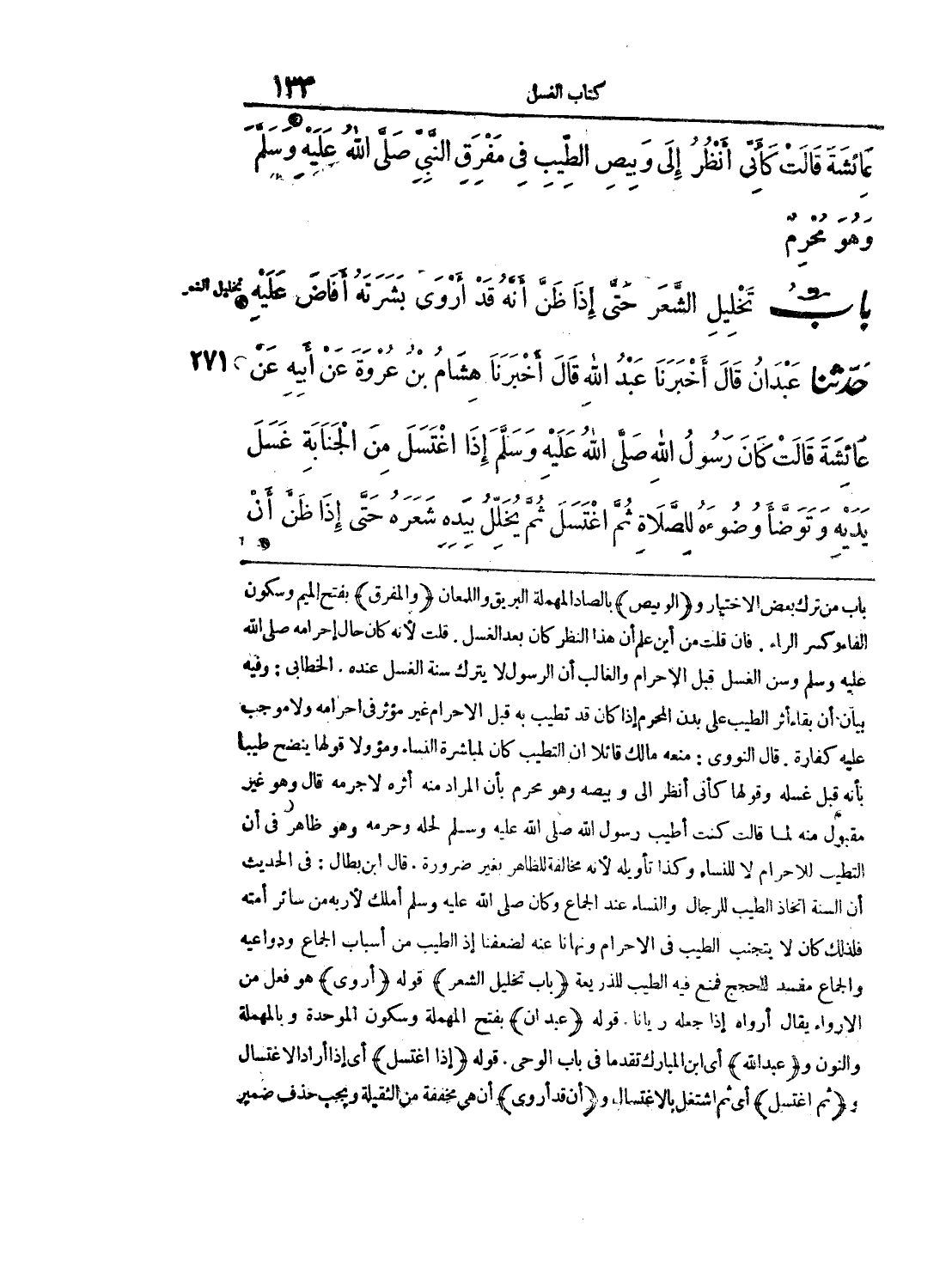 باب من ترك بعض الاختيار و (الوبيص) بالصاد المهملة البريق واللمعان (والمفرق) بفتح الميم وسكون الفاء وكسر الراء. فإن قلت من أين علم أن هذا النظر كان بعد الغسل. قلت لأنه كان حال إحرامه صَلَّى الله عليه وسلّم وسن الغسل قبل الإحرام والغالب أن الرسول لا يترك سنة الغسل عنده. الخطابي: وفيه بيان أن بقاء أثر الطيب على بدن المحرم إذا كان قد تطيب به قبل الإحرام غير مؤثر في إحرامه ولا موجب عليه كفارة. قال النووي: منعه مالك قائلاً أن التطيب كان لمباشرة النساء ومؤولاً قولها ينضح طيباً بأنه قبل غسله وقولها كأني أنظر إلى وبيصه وهو محرم بأن المراد منه أثره لا جرمه قال وهو غير مقبول منه لما قالت كنت أطيب رسول الله صَلَّى الله عليه وسلّم لحله وحرمه وهو ظاهر في أن التطيب للإحرام لا للنساء وكذا تأويله لأنه مخالفة للظاهر بغير ضرورة. قال ابن بطال: في الحديث أن السنة اتخاذ الطيب للرجال والنساء عند الجماع وكان صَلَّى الله عليه وسلّم أملك لأربه من سائر أمته فلذلك كان لا يتجنب الطيب في الإحرام ونهانا عنه لضعفنا إذ الطيب من أسباب الجماع ودواعيه والجماع مفسد للحجج فمنع فيه الطيب للذريعة. (باب تخليل الشعر) قوله (أروي) هو فعل من الإرواء يقال أرواه إذا جعله رياناً. قوله (عبدان) بفتح المهملة وسكون الموحدة وبالمهملة والنون و (عبد الله) أي ابن المبارك تقدماً في باب الوحي. قوله (إذا اغتسل) أي إذا أراد الاغتسال و (ثم اغتسل) أي ثم اشتغل بالاغتسال و (أن قد أروي) أن هي مخففة من الثقيلة ويجب حذف ضمير