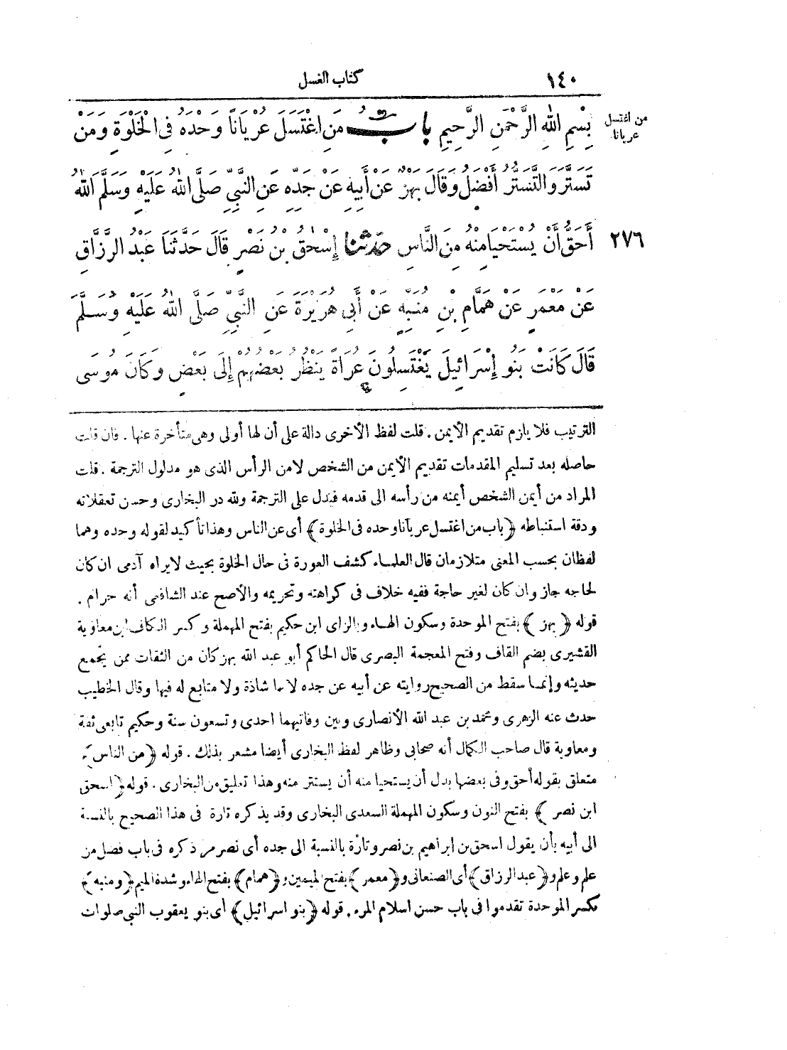 276 - حَدَّثَنَا إِسْحَاقُ بْنُ نَصْرٍ قَالَ حَدَّثَنَا عَبْدُ الرَّزَّاقِ عَنْ مَعْمَرٍ عَنْ هَمَّامِ بْنِ مُنَبِّهٍ عَنْ أَبِى هُرَيْرَةَ عَنِ النَّبِىِّ صَلَّى الله عليه وسلّم قَالَ «كَانَتْ بَنُو إِسْرَائِيلَ يَغْتَسِلُونَ عُرَاةً، يَنْظُرُ بَعْضُهُمْ إِلَى بَعْضٍ، وَكَانَ مُوسَى