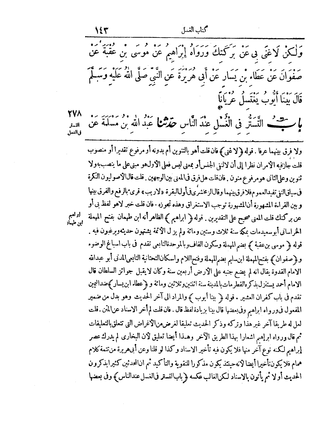 ولا فرق بينهما عرفاً، قوله (لا غنى) فإن قلت أهو بالتنوين أم بدونه أو مرفوع تقديراً أو منصوب قلت جار فيه الأمران نظراً إلى أن لالتقى الجنس أو بمعنى ليس فعلى الأول هو مبني على ما ينصب به ولا تنوين وعلى الاثني هو مرفوع منون، فإن قلت هل فرق في المعنى بين الوجهين، قلت قال الأصوليون النكرة ي سياق النفي تفيد العموم فلا فرق بينهما وقال الزمخشري في أول البقرة "لا ريب" قرئ بالرفع والفرق بينها وبين القراءة المشهورة أن المشهورة توجب الاستغراق وهذه تجوزه. فغن قلت خبر لا هو لفظ بي أو عن بركتك قلت المعنى صحيح على التقديرين. قوله (إبراهيم) الظاهر أنه ابن طهمان بفتح المهملة الخراساني أبو سعيد مات بمكة سنة ثلاث وستين ومائة ولم يزل الأئمة يشتهون حديثه ويرغبون فيه. قوله (موسى بن عقبة) بضم المهملة وسكون القاف وبالموحدة التابعي تقدم في باب إسباغ الوضوء و (صفوان) بفتح المهملة ابن سليم بضم المهملة وفتح اللام وإسكان التحتانية التابعي المدني أبو عبد الله الإمام القدوة يقال انه لم يضع جنبه على الأرض أربعين سنة وكان لا يقبل جوائز السلطان قال الإمام أحمد يستزل بذكره القطر مات بالمدينة سنة اثنتين وثلاثين ومائة و (عطاء ابن يسار) ضد اليمين تقدم في باب كفران العشير. قوله (بينا أيوب) والمراد إلى آخر الحديث وهو بدل من ضمير المفعول في ورواه إبراهيم وفي بعضها قال بينا بزيادة لفظ قال. فإن قلت لم أخر الإسناد عن المتن. قلت لعل له طريقاً آخر غير هذا وتركه وذكر الحديث تعليقاً لغرض من الأغراض التي تتعلق بالتعليقات ثم قال ورواه إبراهيم إشعاراً بهذا الطريق الآخر وهذا أيضاً تعليق لأن البخاري لم يدرك عصر إبراهيم لكنه نوع آخر منها فلا يكون في تأخير الإسناد وكذا لو قلنا وعن أبي هريرة من تتمة كلام همام فلا يكون تأخيراً أيضاً لأنه حينئذ يكون مذكوراً للتقوية والتأكيد ثم أن المحدثين كثيراً يكرون الحديث أولاً ثم يأتون بالإسناد لكن الغالب عكسه (باب التستر في الغسل عند الناس) وفي بعضها