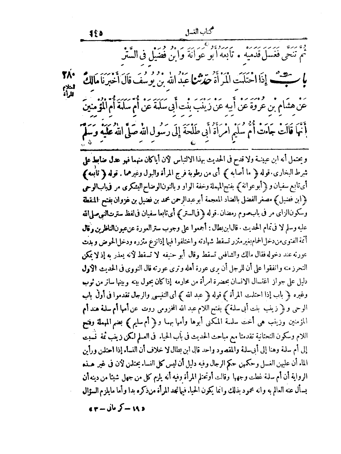 ويحتمل أنه ابن عيينة ولا قدح في الحديث بهذا الالتباس لأن أياً كان منهما فهو عدل ضابط على شرط البخاري. قوله (ما أصابه) أي من رطوبة فرج المرأة والبول وغيرهما. قوله (تابعه) أي تابع سفيان و (أبو عوانة) بفتح المهملة وخفة الواو وبالنون الوضاح اليشكري مر في باب الوحي (ابن فضيل) مصغر الفضل بالضاد المعجمة أبو عبد الرحمن محمد بن فضيل بن غزوان بفتح المنقطة وسكون الزاي مر في باب صوم رمضان. قوله (في الستر) أي تابعا سفيان في لفظ سترت النبي صلى الله عليه وسلم لا في تمام الحديث. قال ابن بطال: أجمعوا على وجوب ستر العورة عن عيون الناظرين وقال أئمة الفتوى من دخل الحمام بغير منزر تسقط شهادته واختلفوا فيما إذا نزع منزره ودخل الحوض وبدت عورته عند دخوله فقال مالك والشافعي تسقط وقال أبو حنيفة لا تسقط لأنه يعذر به إذ لا يمكن التحرز منه واتفقوا على أن للرجل أني رى عورة أهله وترى عورته قال النووي في الحديث الأول دليل على جواز اغتسال الإنسان بحضرة امرأة من محارمه إذا كان يحول بينه وبينها ساتر من ثوب وغيره (باب إذا احتلمت المرأة) قوله (عبد الله) أي التنيسي والرجال تقدموا في أول باب الوحى و (زينب بنت أبي سلمة) بفتح اللام عبد الله المخزومي روت عن أمها أم سلمة هند أم المؤمنين وزينب هي أخت سلمة المكنى أبوها وأمها بهما و (أم سليم) بضم المهملة وفتح اللام وسكون التحتانية تقدمتا مع مباحث الحديث في باب الحياء في العلم لكن زينب ثمة نسبت إلى أم سلمة وهنا إلى أبي سلمة والمقصود واحد قال ابن بطال لا خلاف أن النساء إذا احتلمن ورأين الماء أن عليهن الغسل وحكمهن حكم الرجال وفيه دلل أن ليس كل النساء يحتلمن لأن في غير هذه الرواية أن أم سلمة غطت وجهها وقالت أو تحتلم المرأة وفيه أنه يلزم كل من جهل شيئاً من دينه أن يسأل عنه العالم به وأنه محمود بذلك وإنما يكون الحياء فيما تجد المرأة من ذكره بدا وأما ما يلزم السؤال