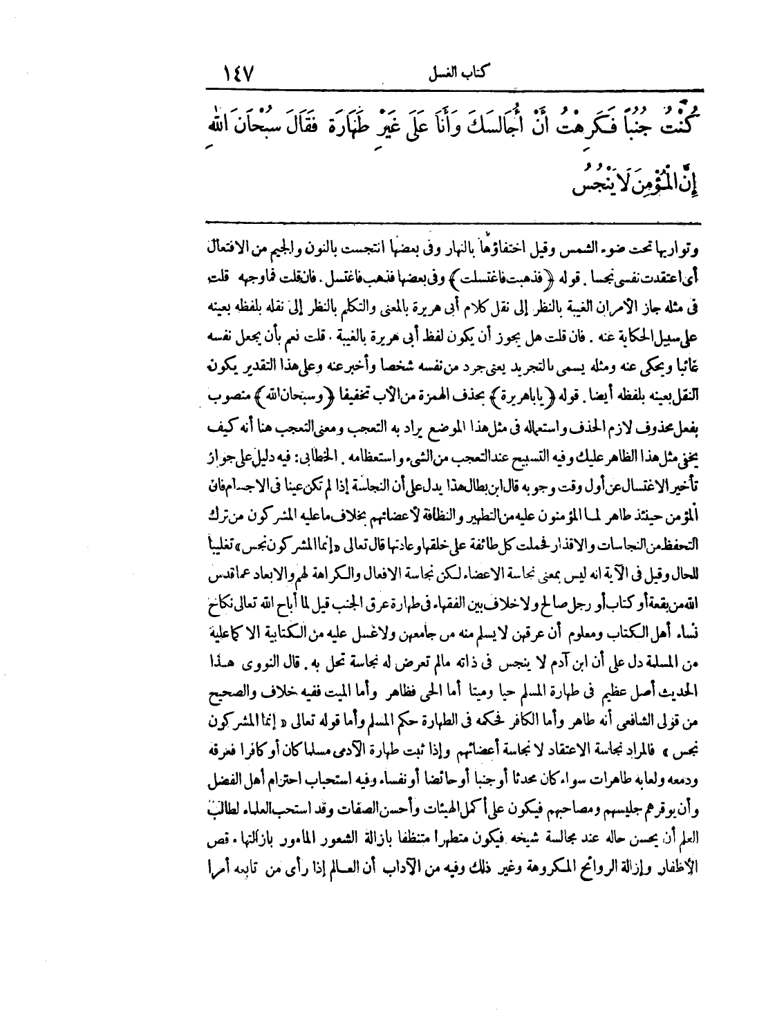 كُنْتُ جُنُباً، فَكَرِهْتُ أَنْ أُجَالِسَكَ وَأَنَا عَلَى غَيْرِ طَهَارَةٍ. فَقَالَ «سُبْحَانَ اللَّهِ، إِنَّ الْمُؤْمِنَ لاَ يَنْجُسُ».